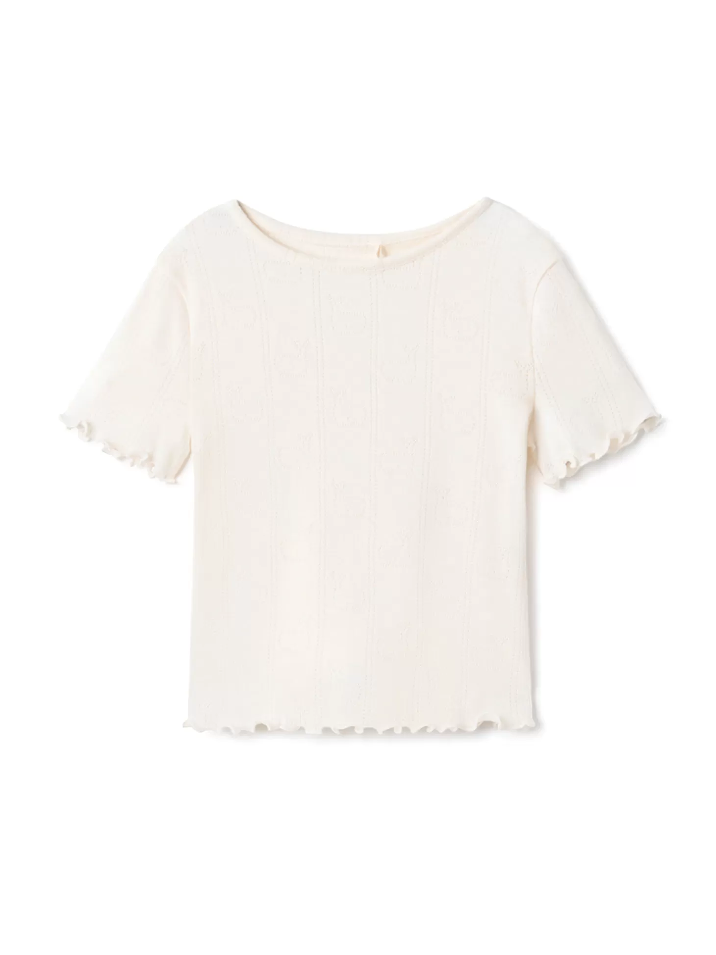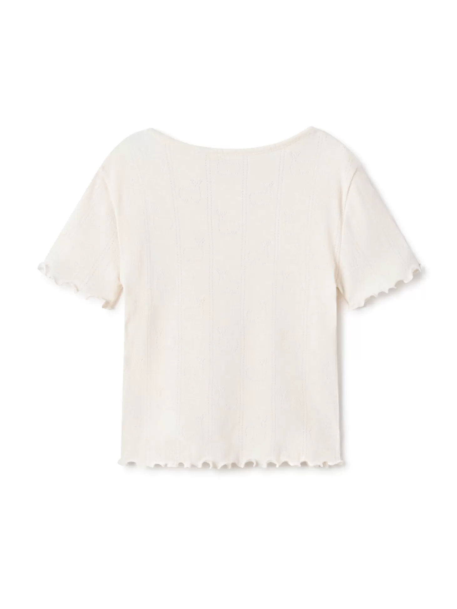 Wir sehen Wale! Unser Oberteil Maho ist aus einem leichten, weichen Stoff gefertigt und mit Wal-Motiven im Pointelle-Stil überzogen. Das T-Shirt hat eine normale Passform.