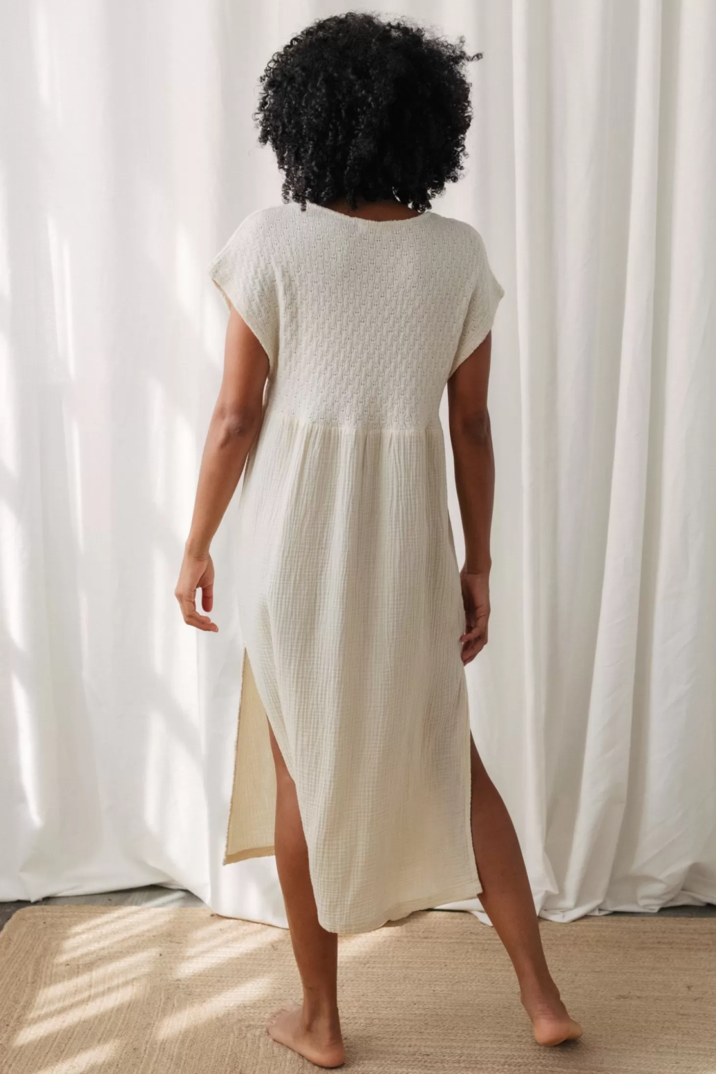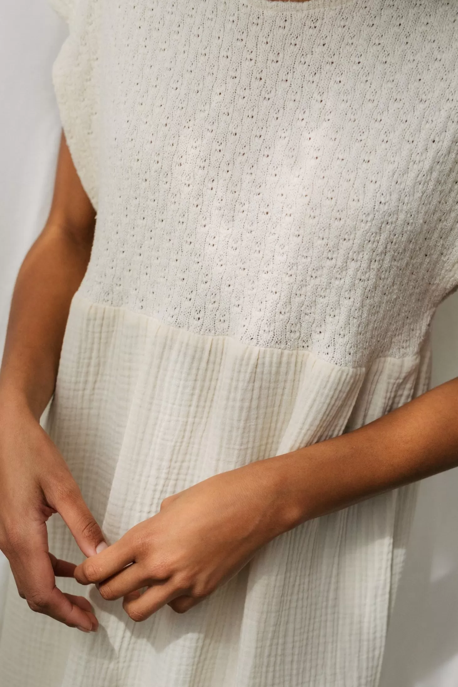 Das Simonszand-Kleid kombiniert ein zartes, durchbrochenes Oberteil mit einem wunderbar weichen Musselin-Rock. Es ist ärmellos und hat ein Armloch, das fast die gesamte Länge des Oberteils einnimmt.