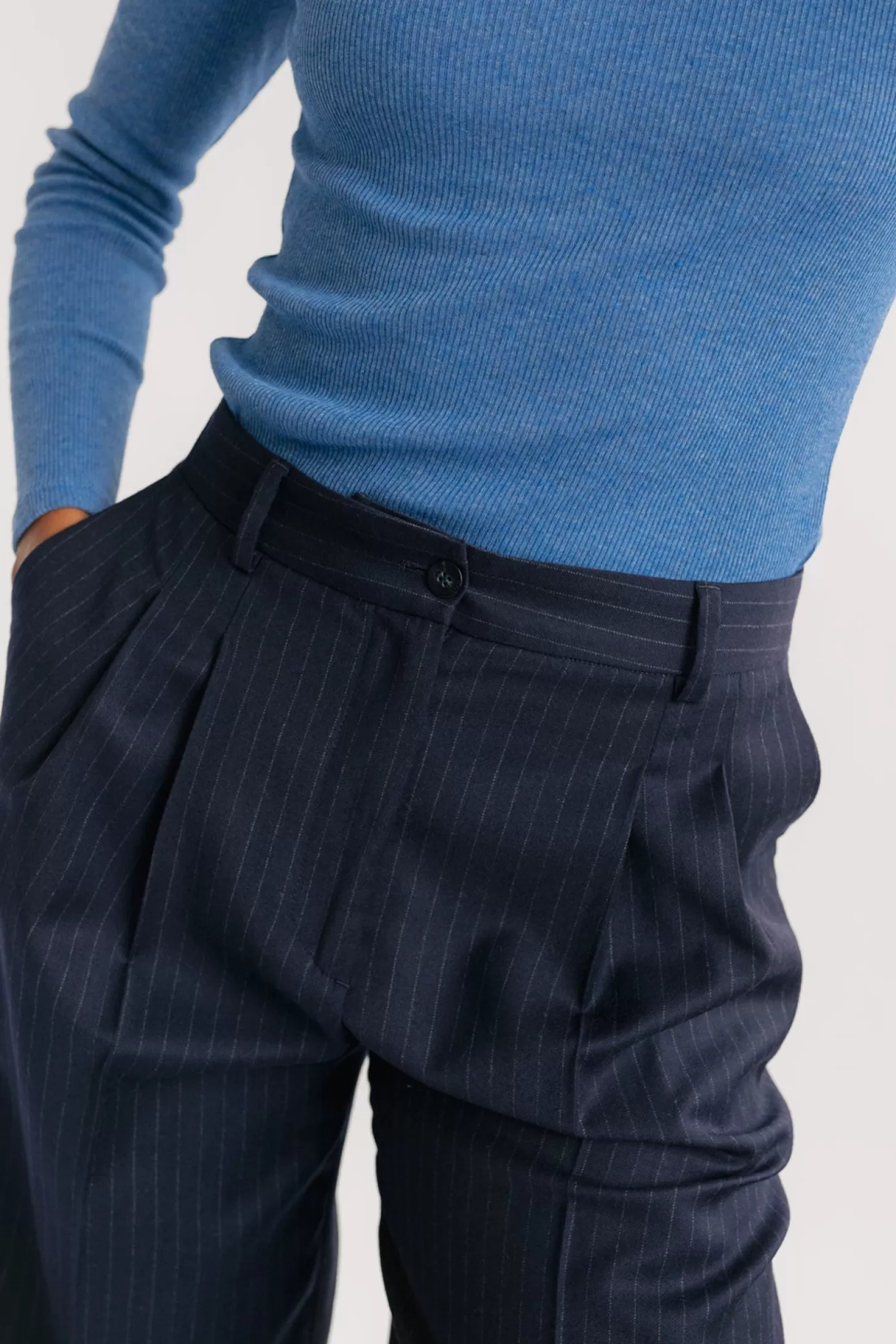 Ethische Nadelstreifenhosen sind schwer zu bekommen, aber jetzt sind die Belall-Hosen da, um deinen Kleiderschrank und das Meer zu retten. Sie haben auffällige Bügelfalten vorne und vier Taschen.