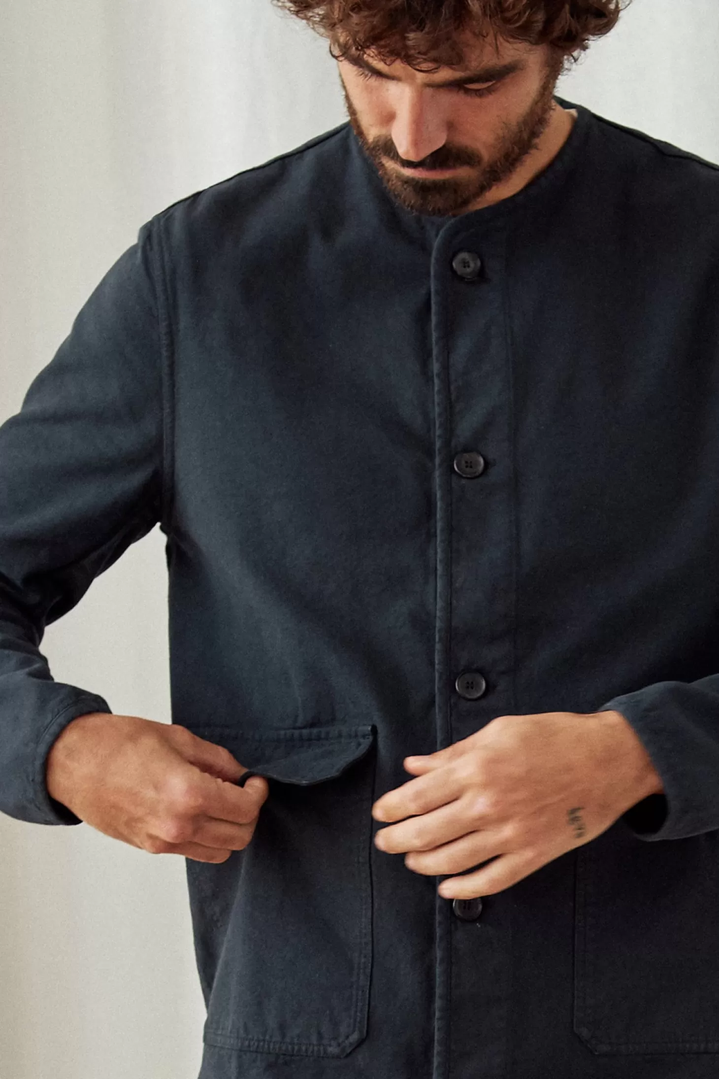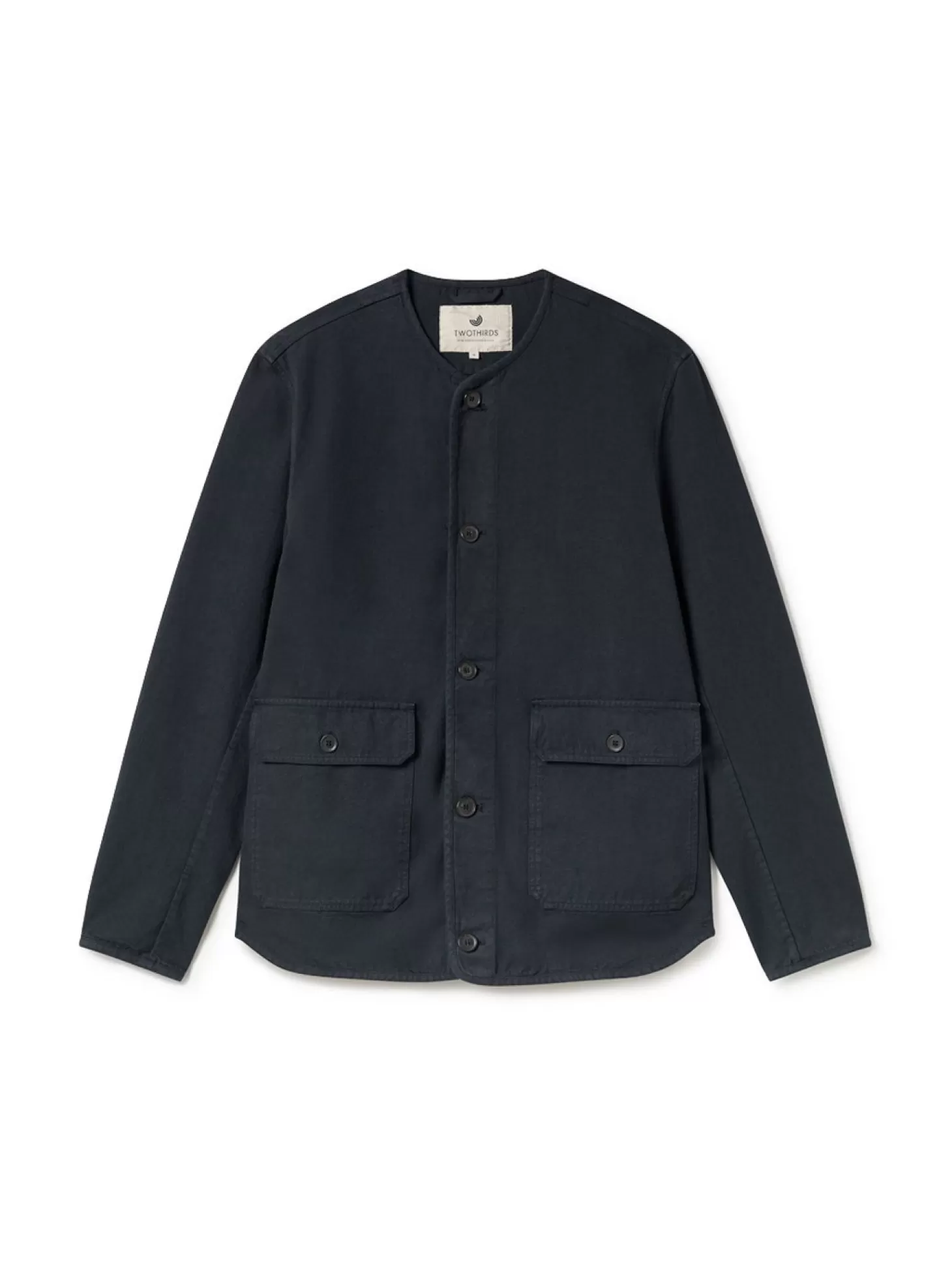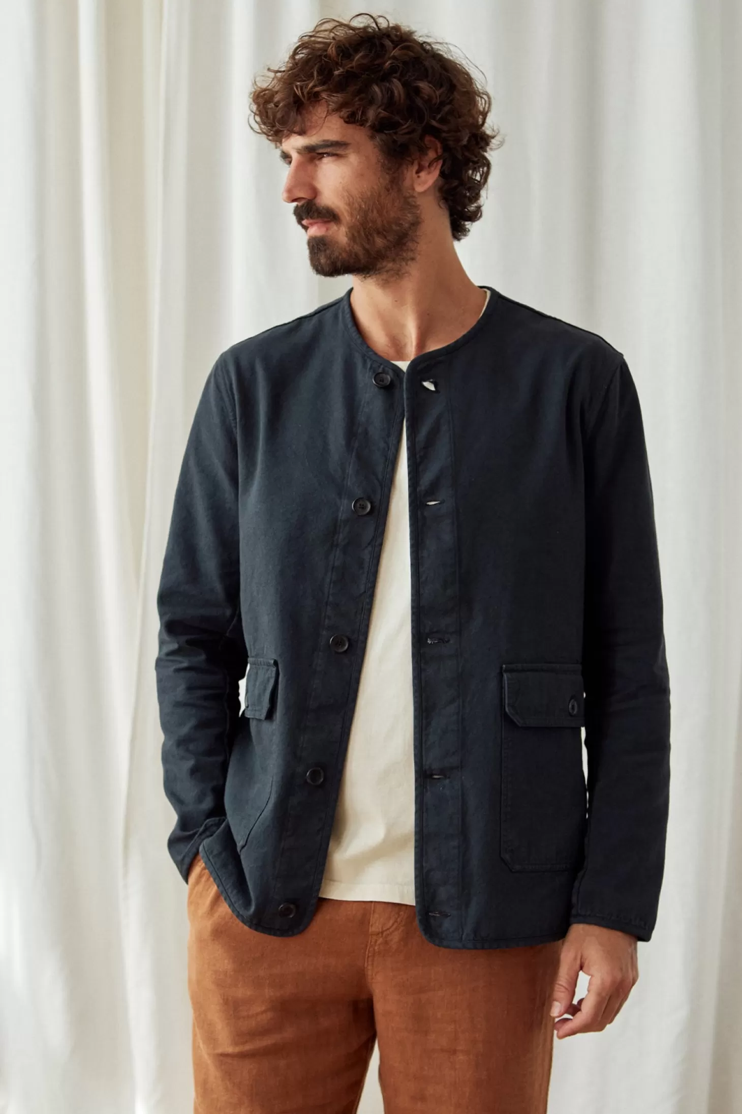 Eine leichte Canvas-Jacke, die den umweltfreundlichsten Stoff aus Altbeständen mit atemberaubenden Designmerkmalen wie einem kragenlosen Ausschnitt und zwei Vordertaschen kombiniert.