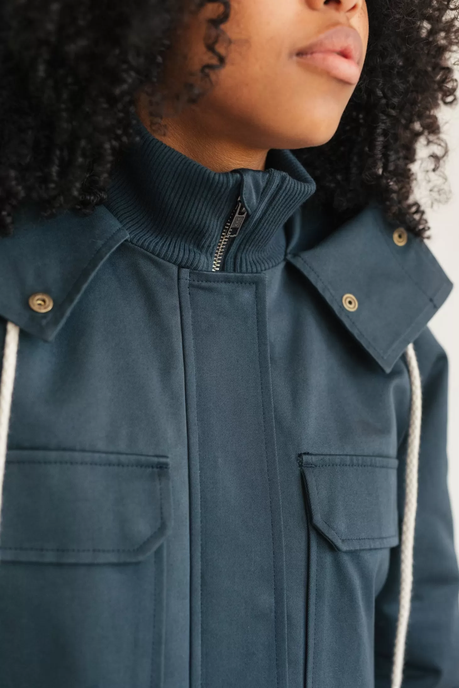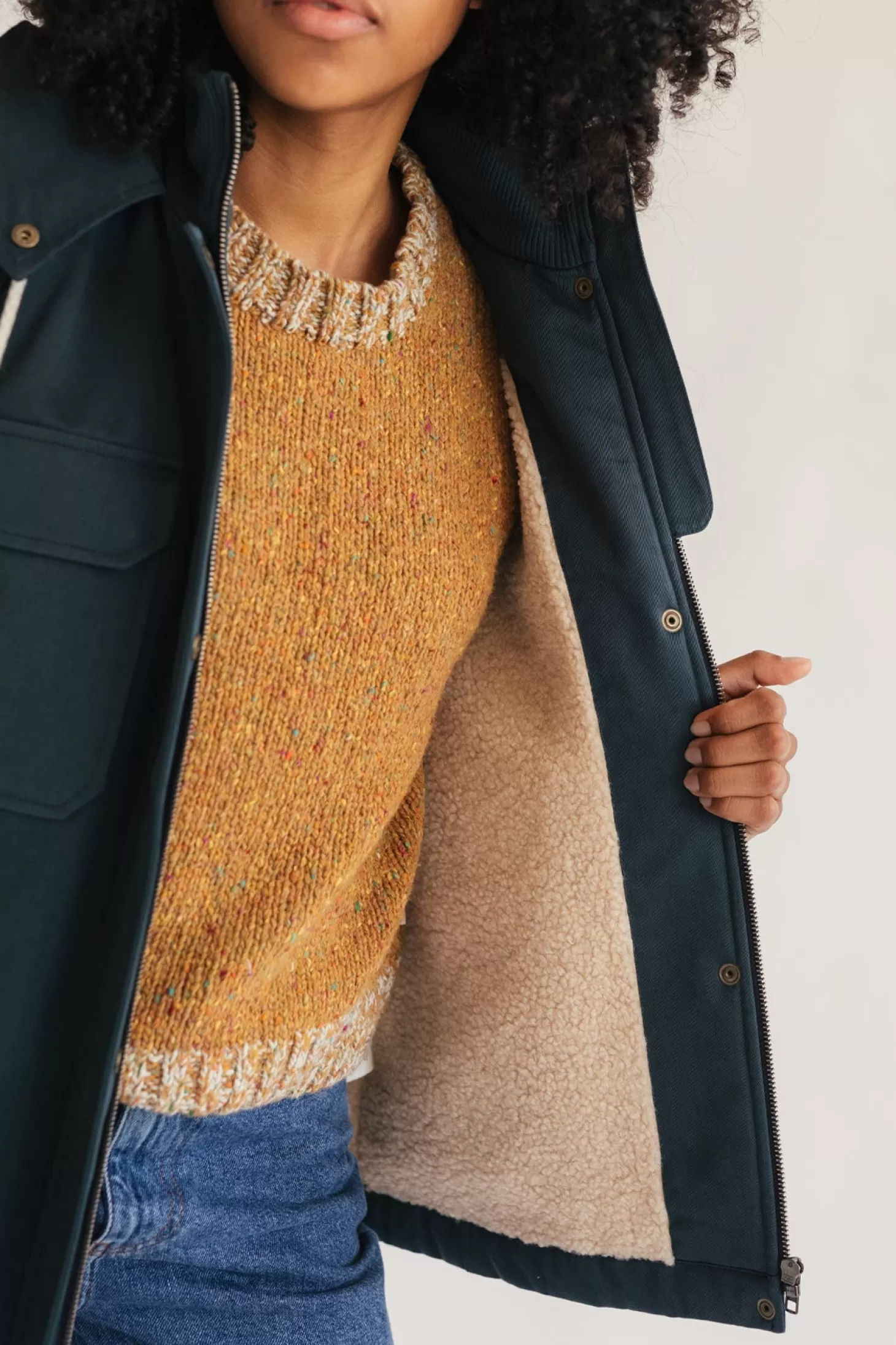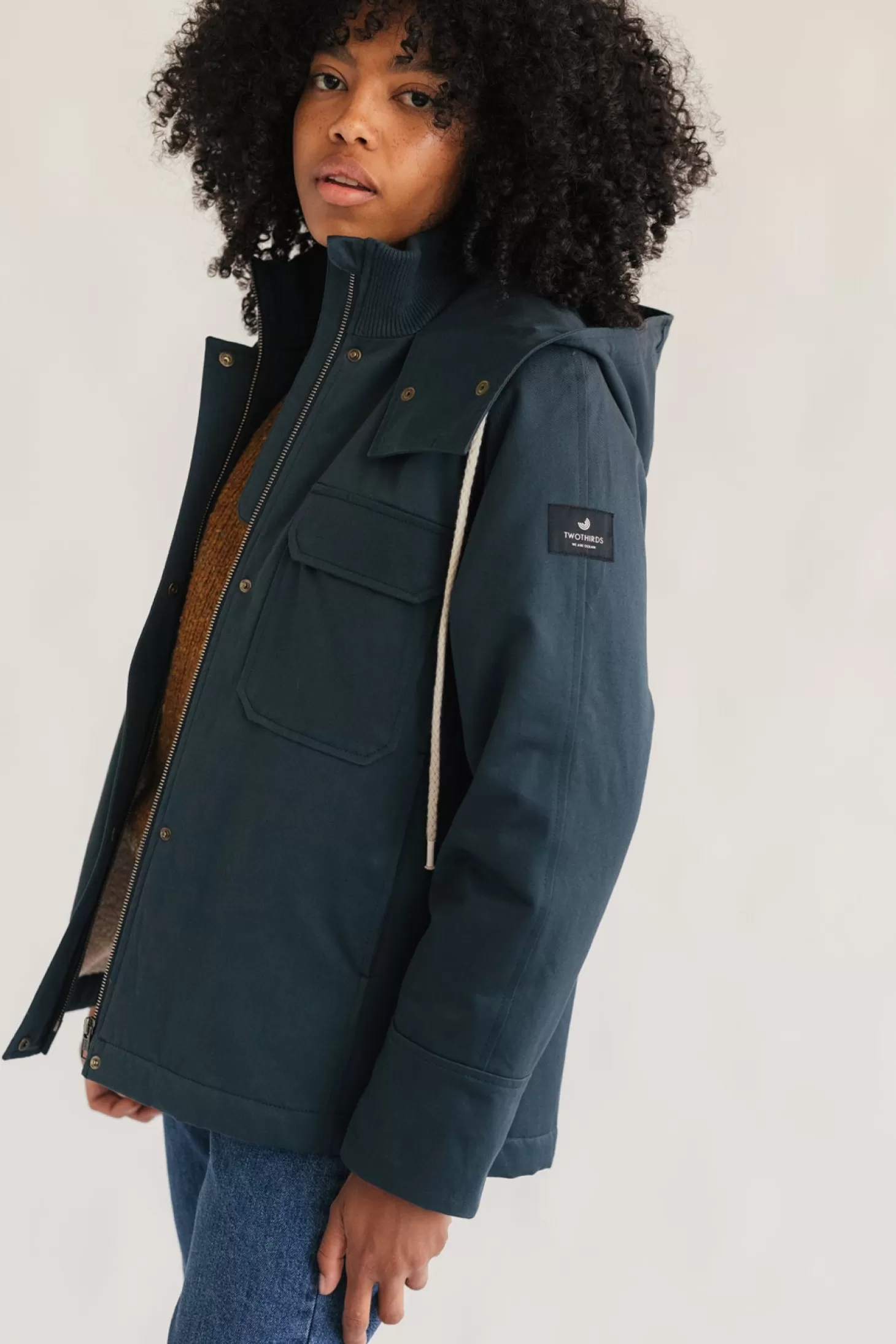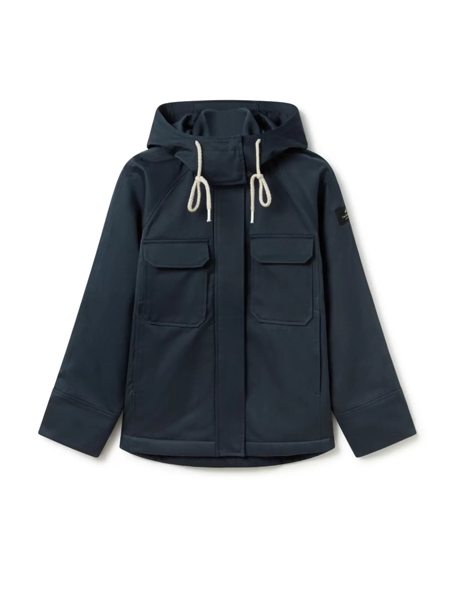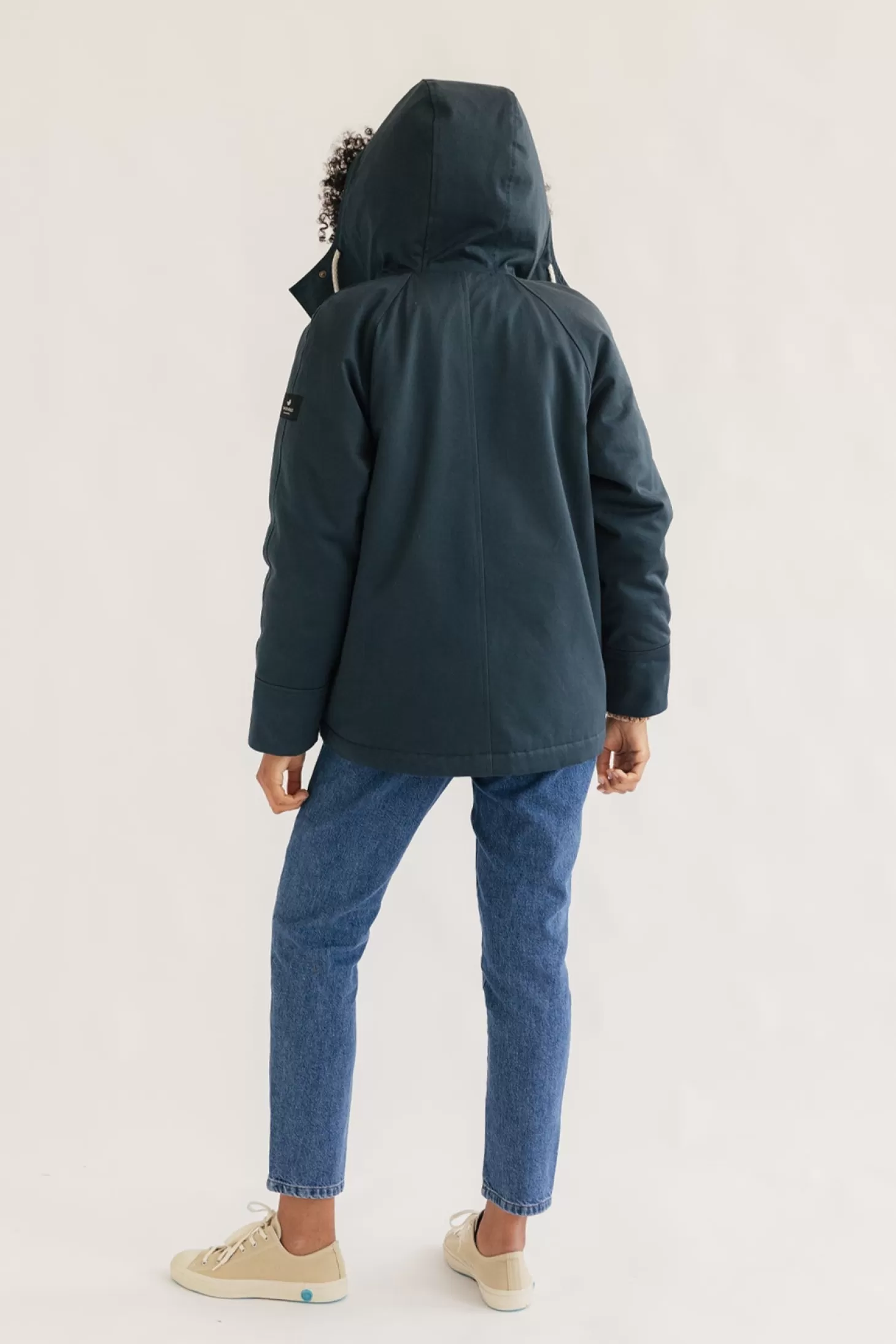 Dieser kurze, nachhaltige Parka ist eine atemberaubende Mischung aus Stil und Substanz. Die organische Außenhülle ist wasserabweisend und hat eine Knopfleiste mit Druckknopfverschluss, um den Wind abzuhalten.