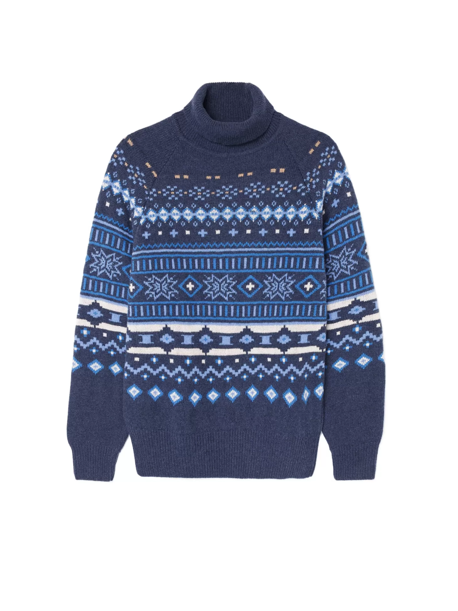 Der Indaqui ist ein Jacquard-Strickpullover, dessen Musterdesign aus einer Mischung aus kuscheliger Wolle und flexiblen recycelten Stoffen besteht und der mit seinem kuscheligen Rollkragen so wärmend ist.