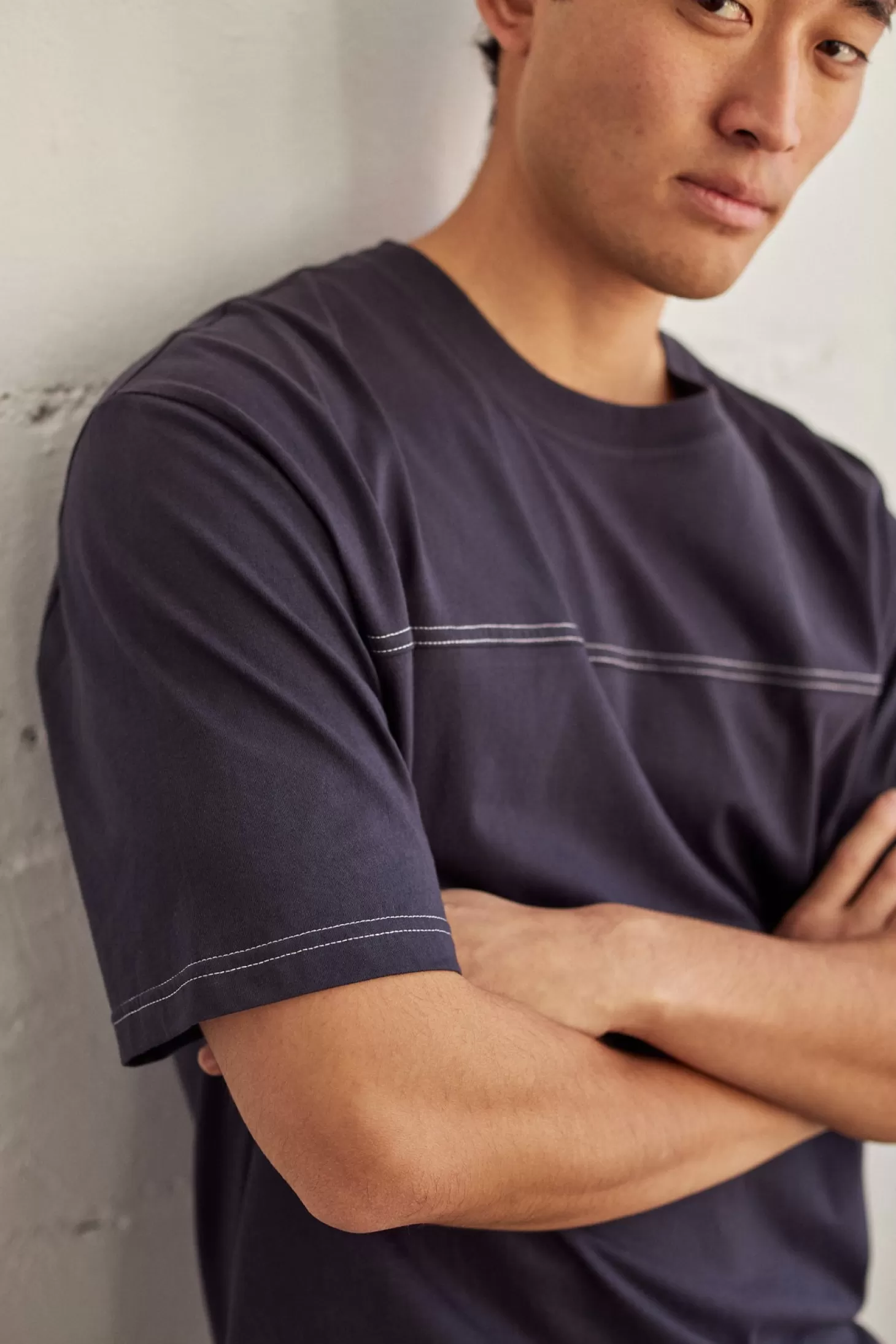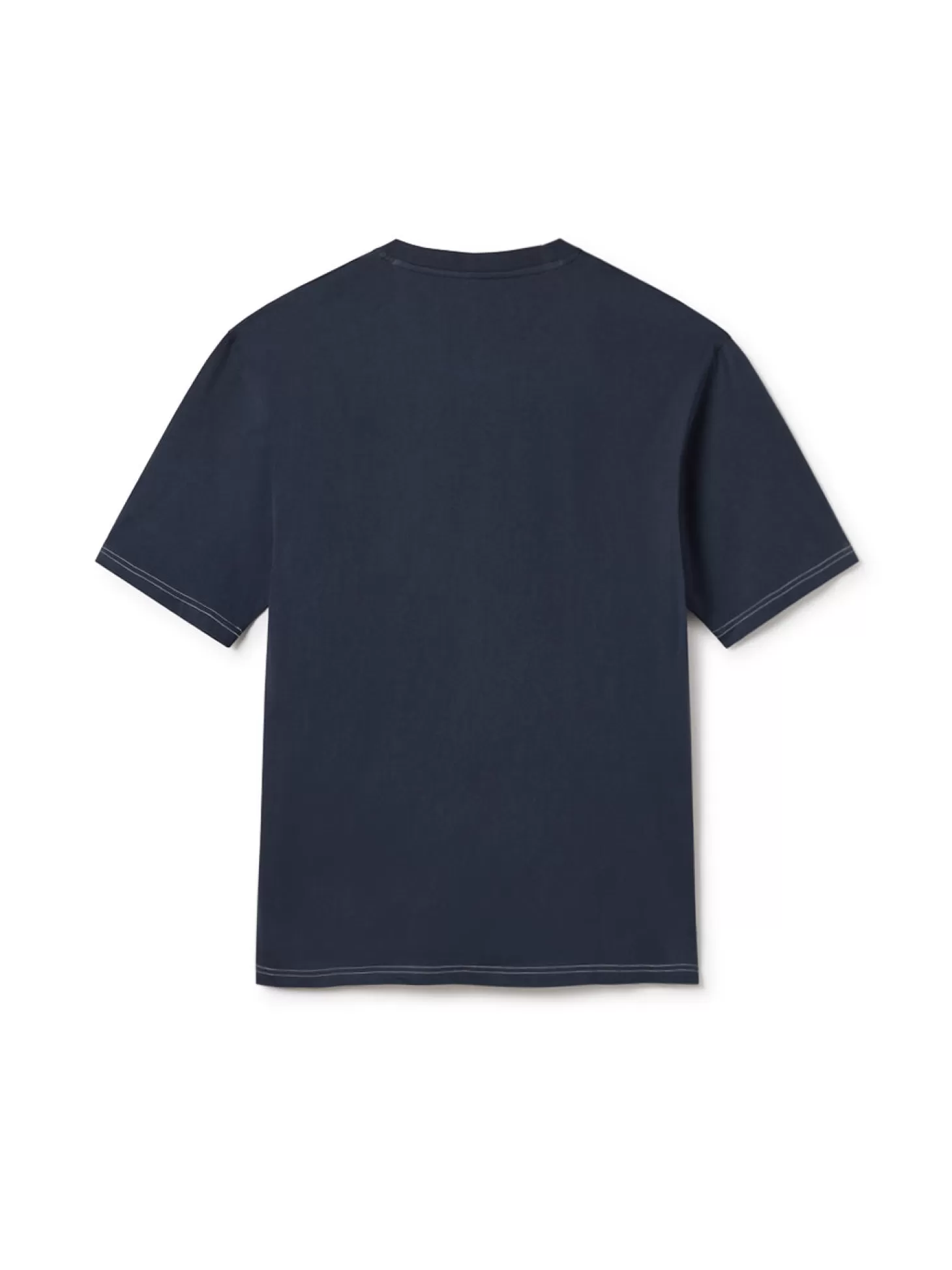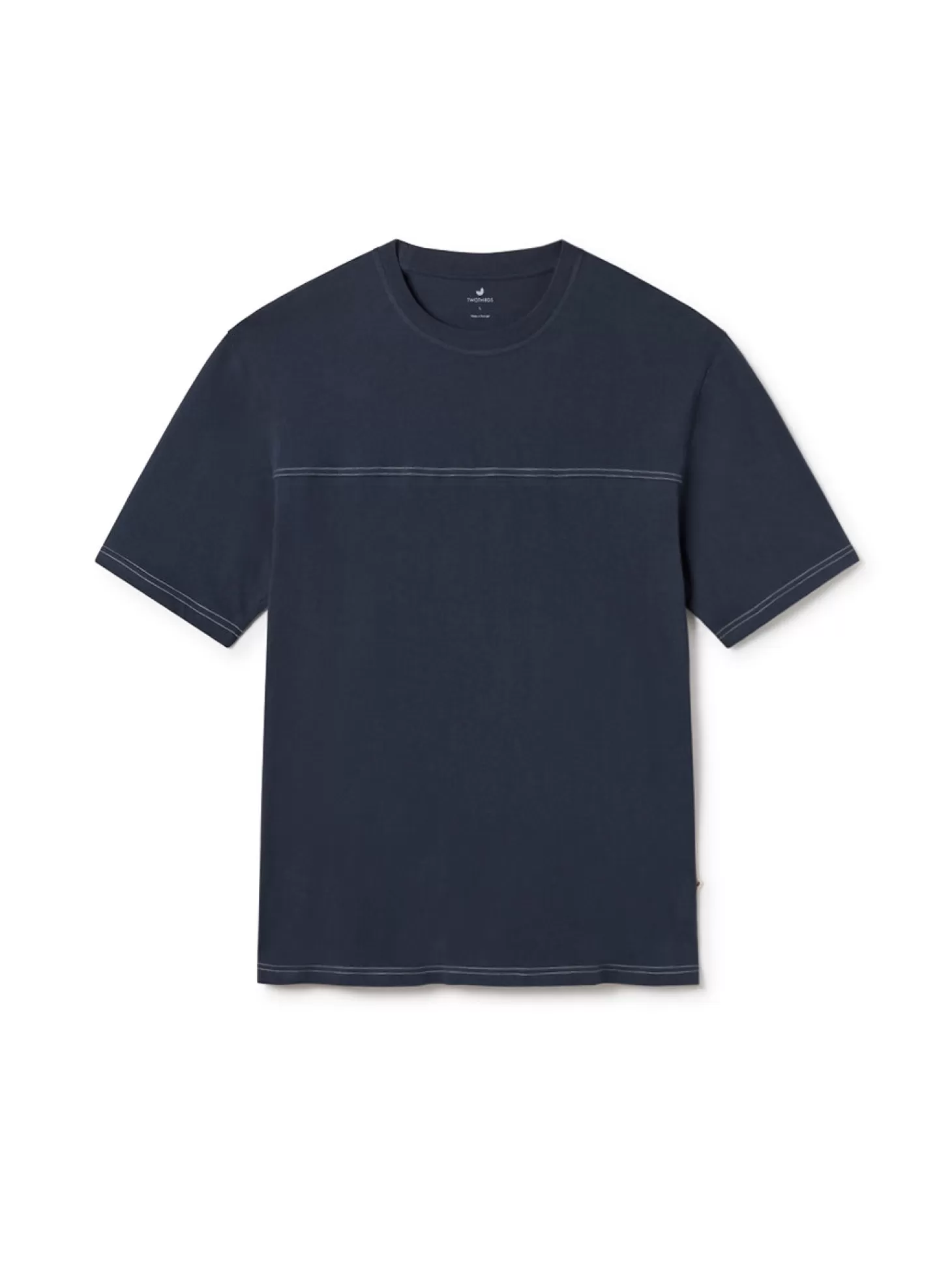 „Perfekt genäht!“ So lässt sich dieses umweltfreundliche T-Shirt vielleicht am besten beschreiben: Sein weicher und nachhaltiger Stoff ist mit einem Zierstichmuster verziert, das an einen Meereshorizont erinnert.