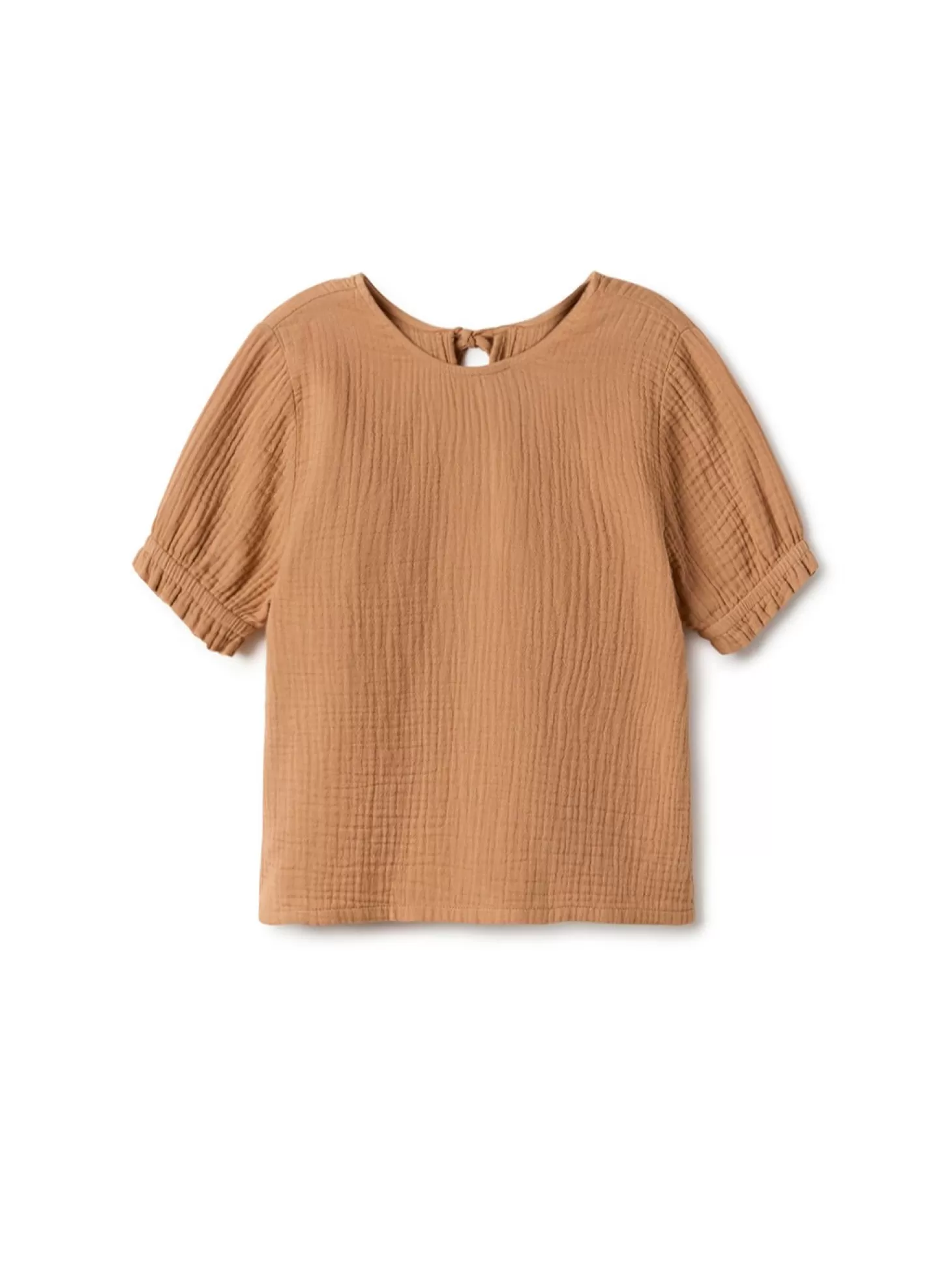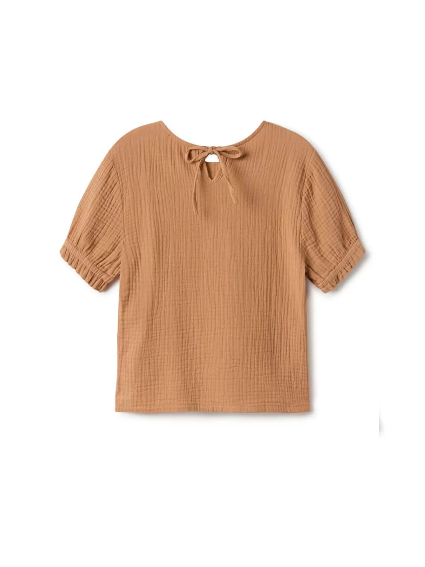 Sommerfarben für die sonnigsten Tage: das wunderschöne Caminha-T-Shirt. Das Kleidungsstück hat geraffte Ärmel und gerüschte Bündchen – mit Schleife im Nacken für den femininen Touch.Designed in Barcelona. Crafted in Portugal.u0026nbsp;Musselinstoff aus 100 % Bio-Baumwolle Pestizidfrei und reduzierte WasserverschwendungVegan
