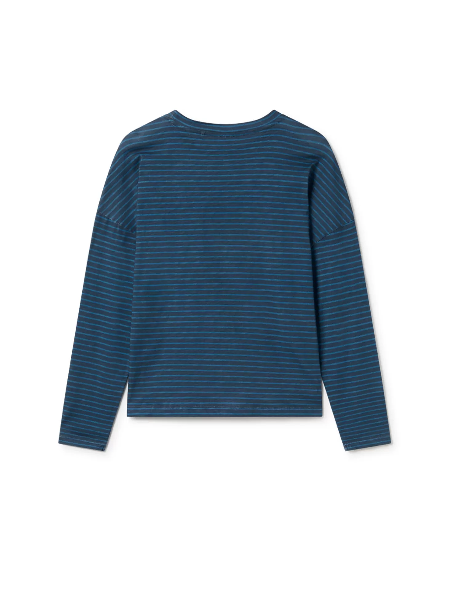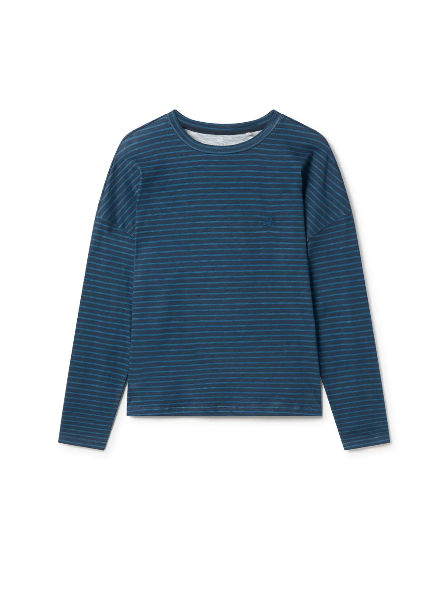 Keine Streifen, kein Sommer! Hier kommt unser nachhaltiges T-Shirt Verte, hergestellt aus feinster Bio-Baumwoll-Slubfaser, mit garngefärbten Streifen, lockeren Schultern und unserem beliebten gestickten Wal.