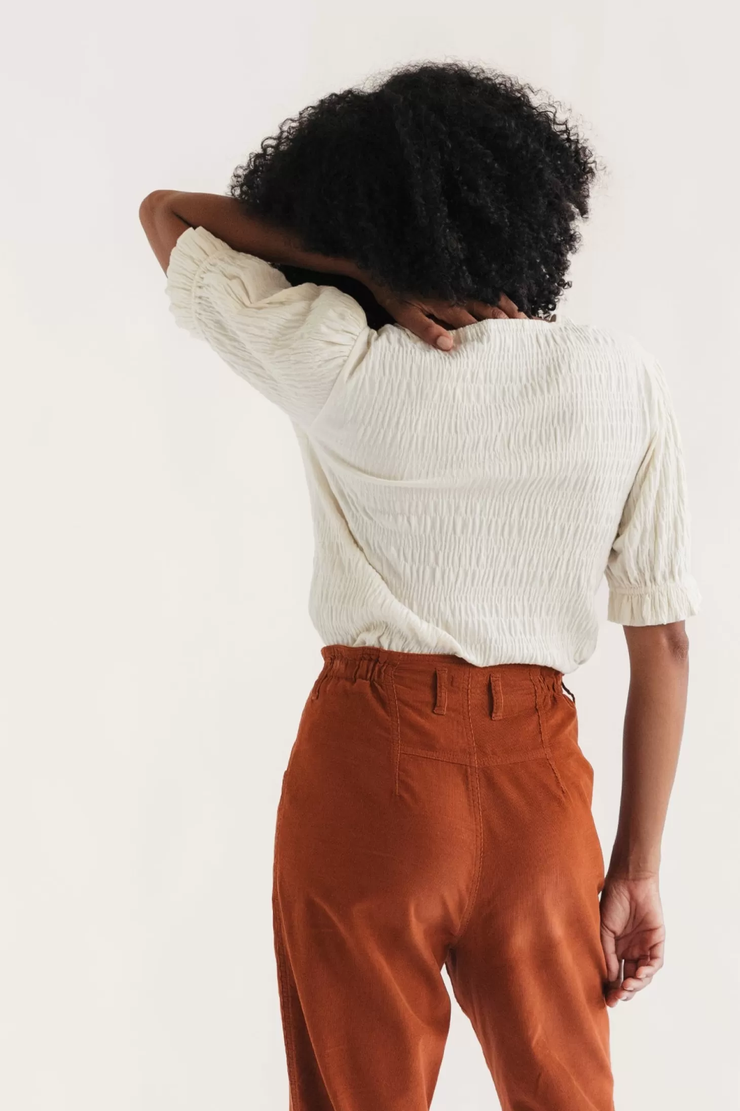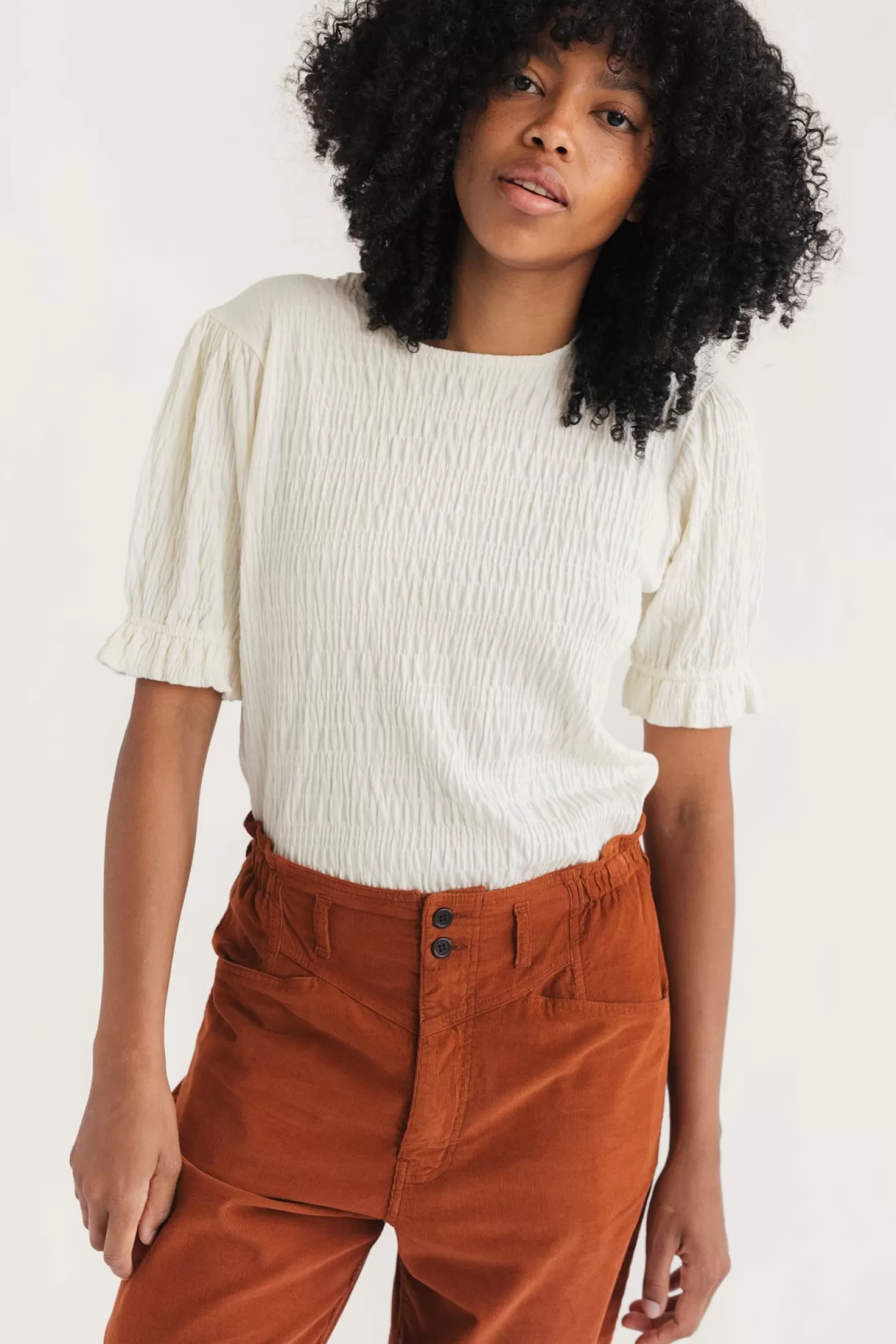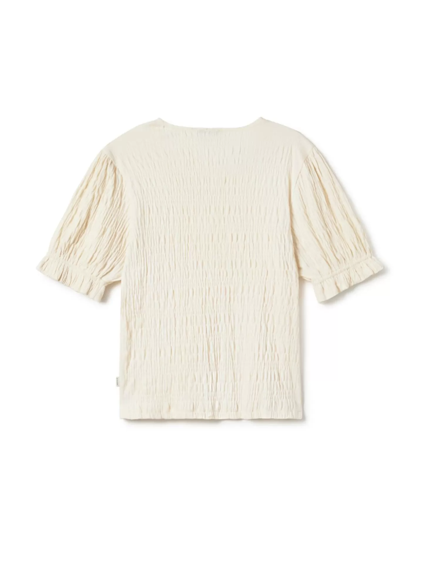 Ein entzückender Rüscheneffekt macht das nachhaltige Boyard-Oberteil zu einem Vergnügen, wenn das Quecksilber am Strand steigt. Seine leicht gepufften Ärmel sind an den Manschetten gerafft.