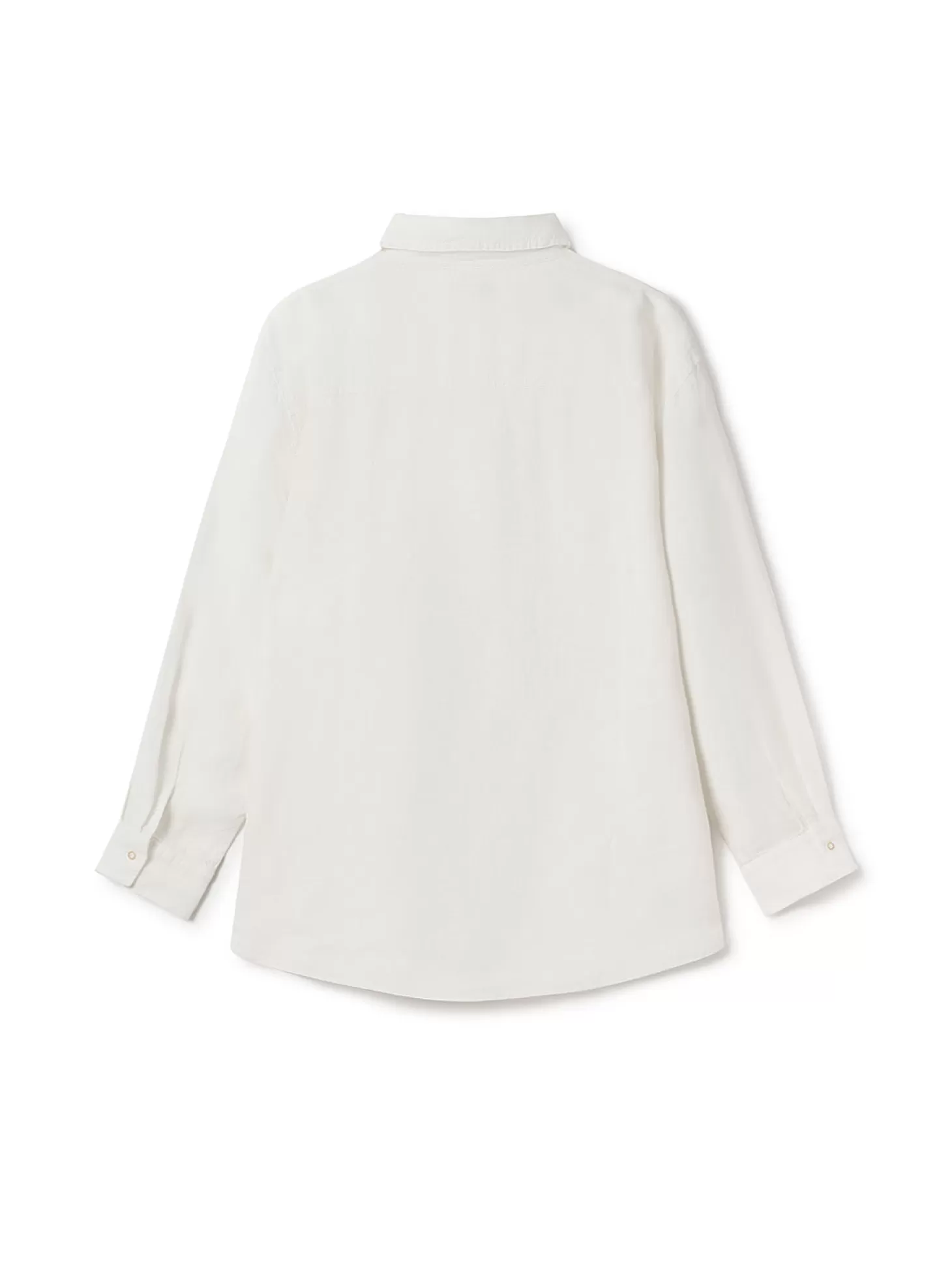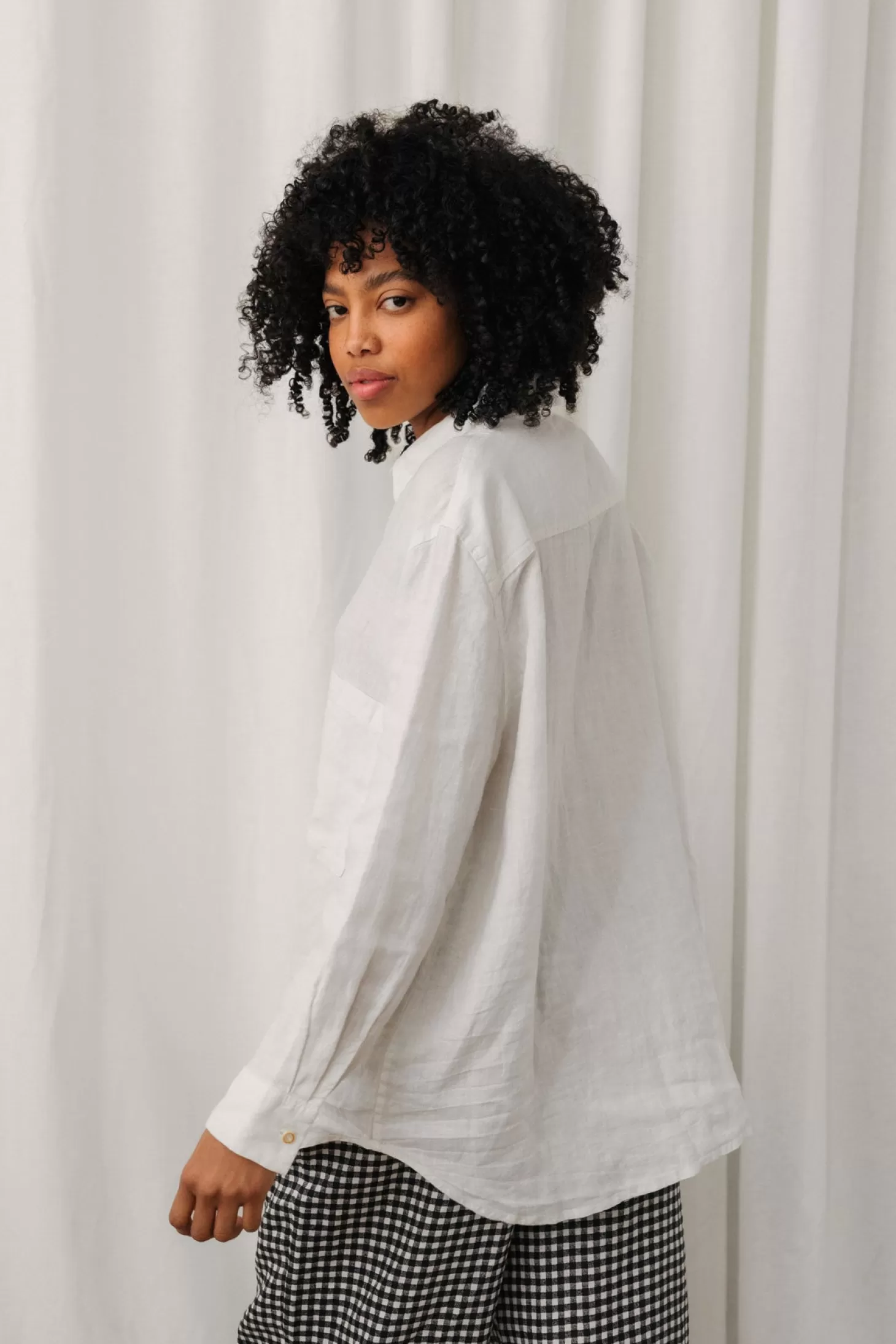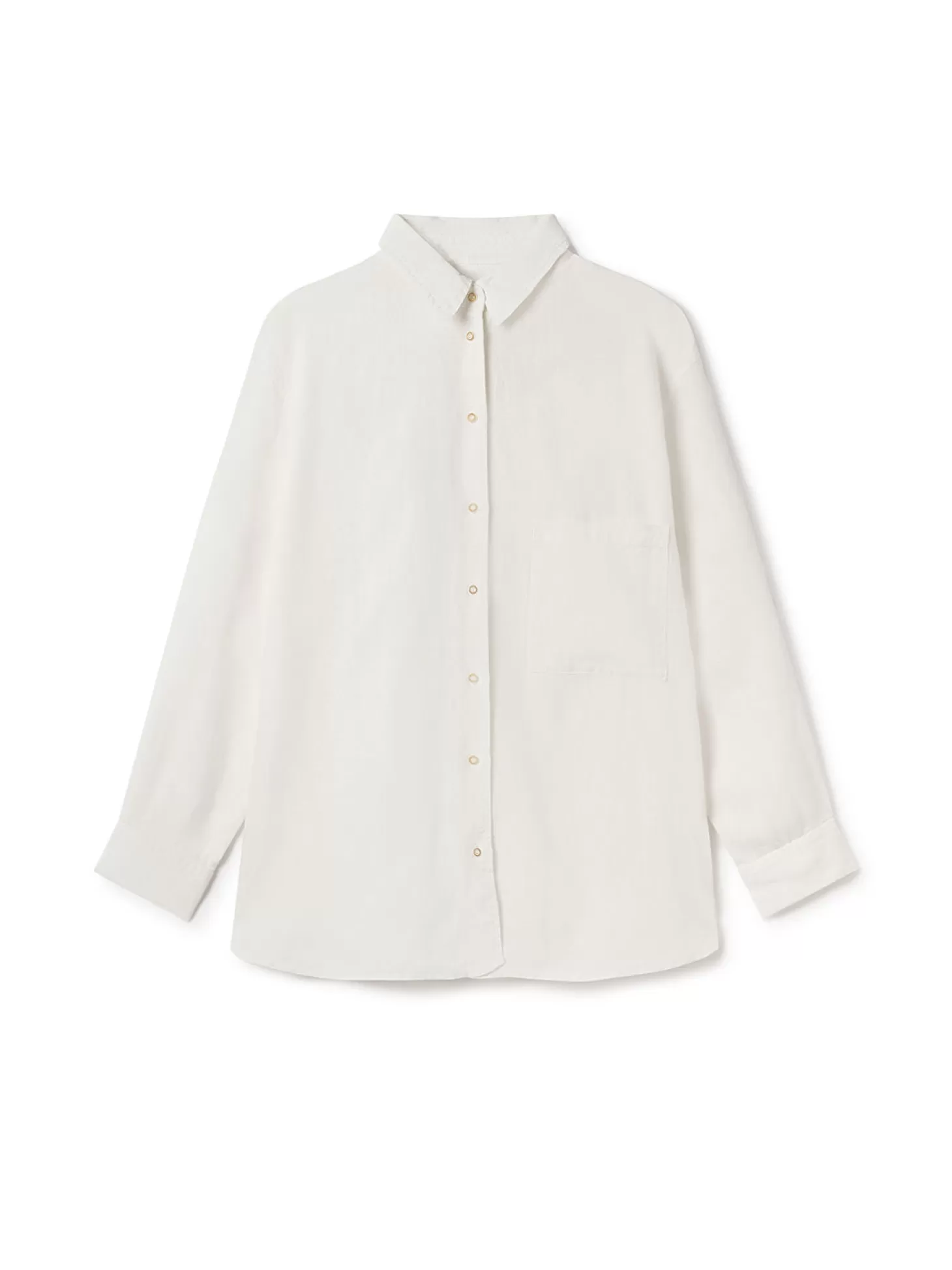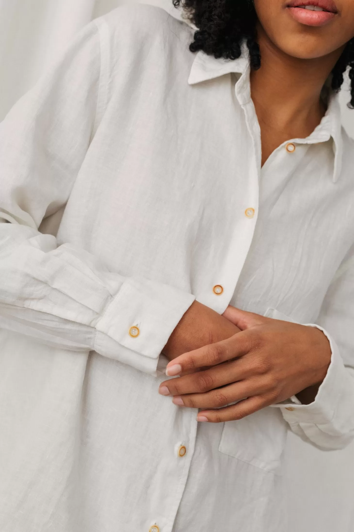 Ein übergroßes Leinenhemd, das unzählige Outfit-Inspirationen bietet: Binde es vorne oder trage es schulterfrei, mit Gürtel, als kurzes Kleid, über einem Unterhemd, teilweise zugeknöpft … die Möglichkeiten sind endlos!