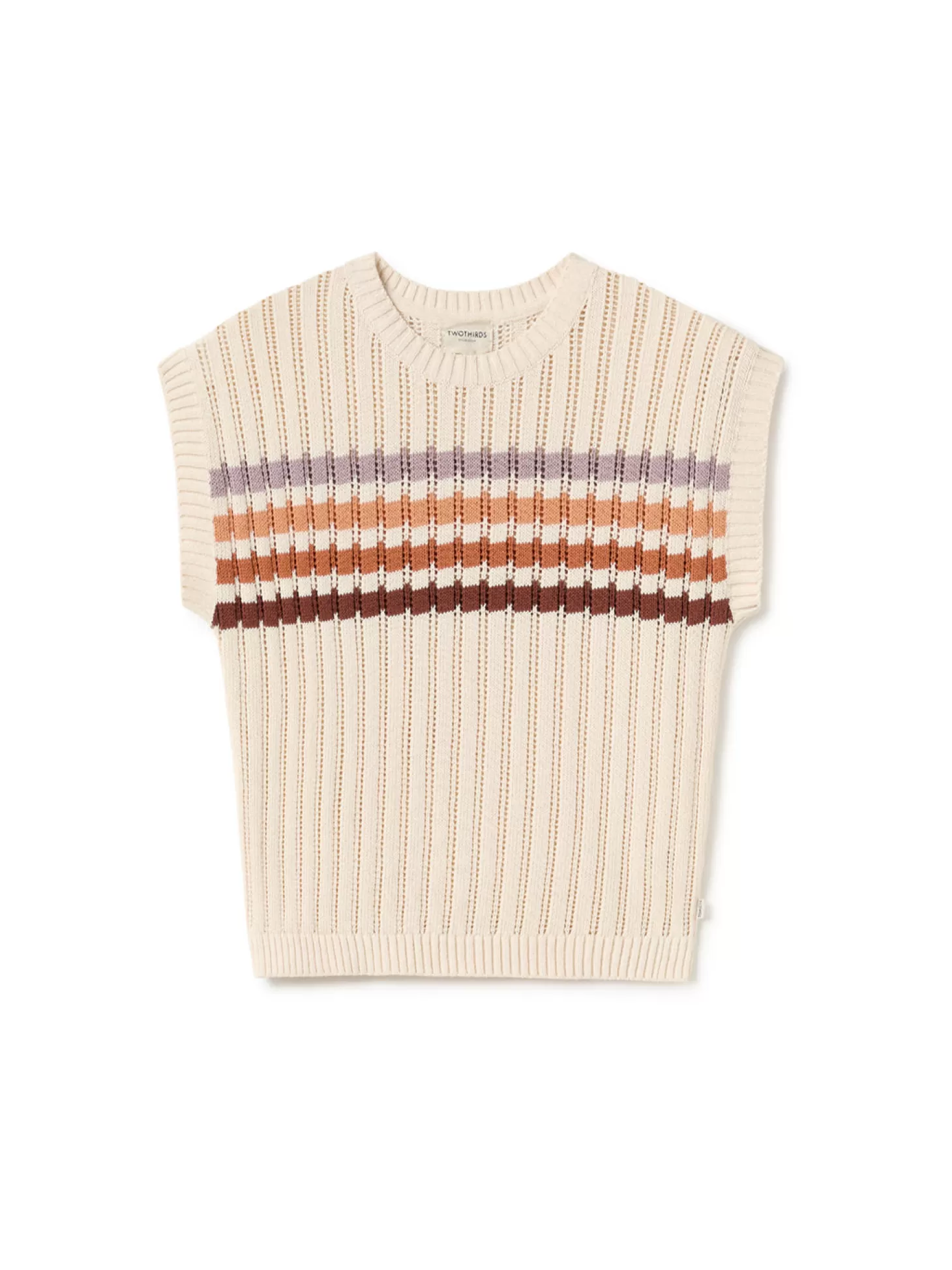 Boasting an openwork knit design, capped sleeves and beautiful stripes, the Motutapu is a piece that can be paired effortlessly with almost any sustainable short, trouser or skirt.