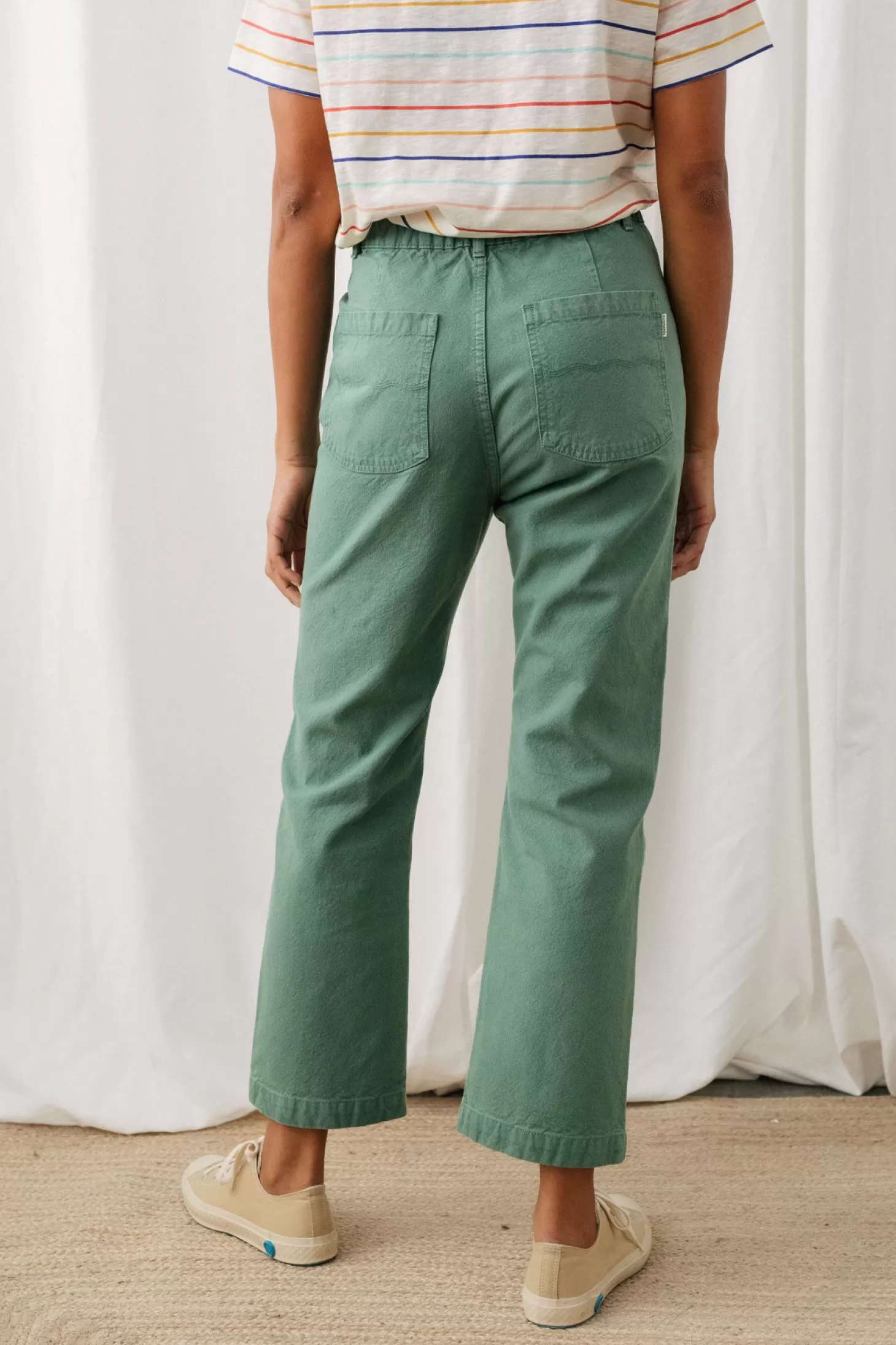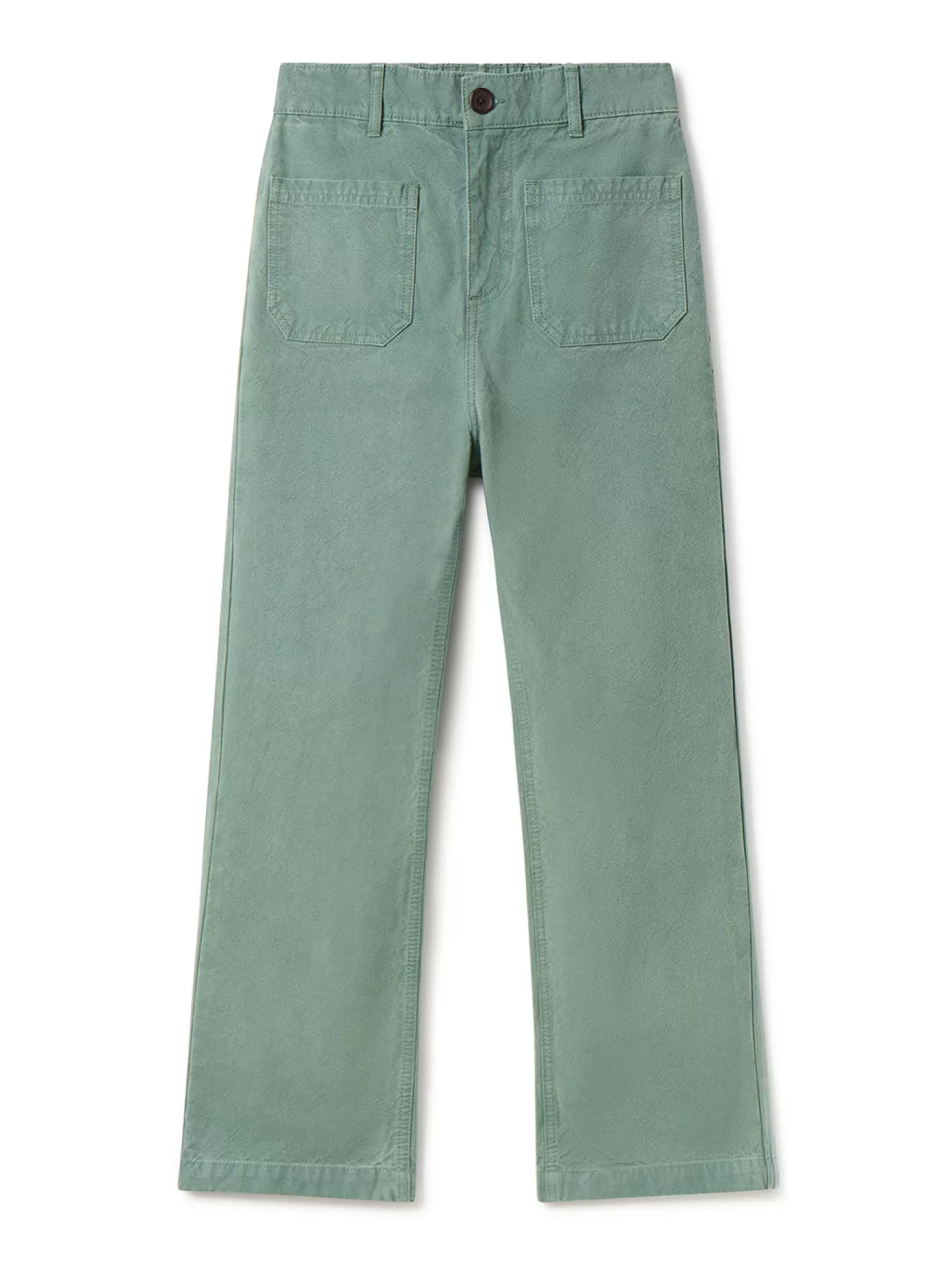 Die Yunosti-Hose ist aus dem umweltfreundlichsten Stoff hergestellt und verfügt über vier aufgesetzte Taschen, die beiden hinteren sind mit einer wunderschönen Wellenstickerei versehen. Elastischer Bund am Rücken.