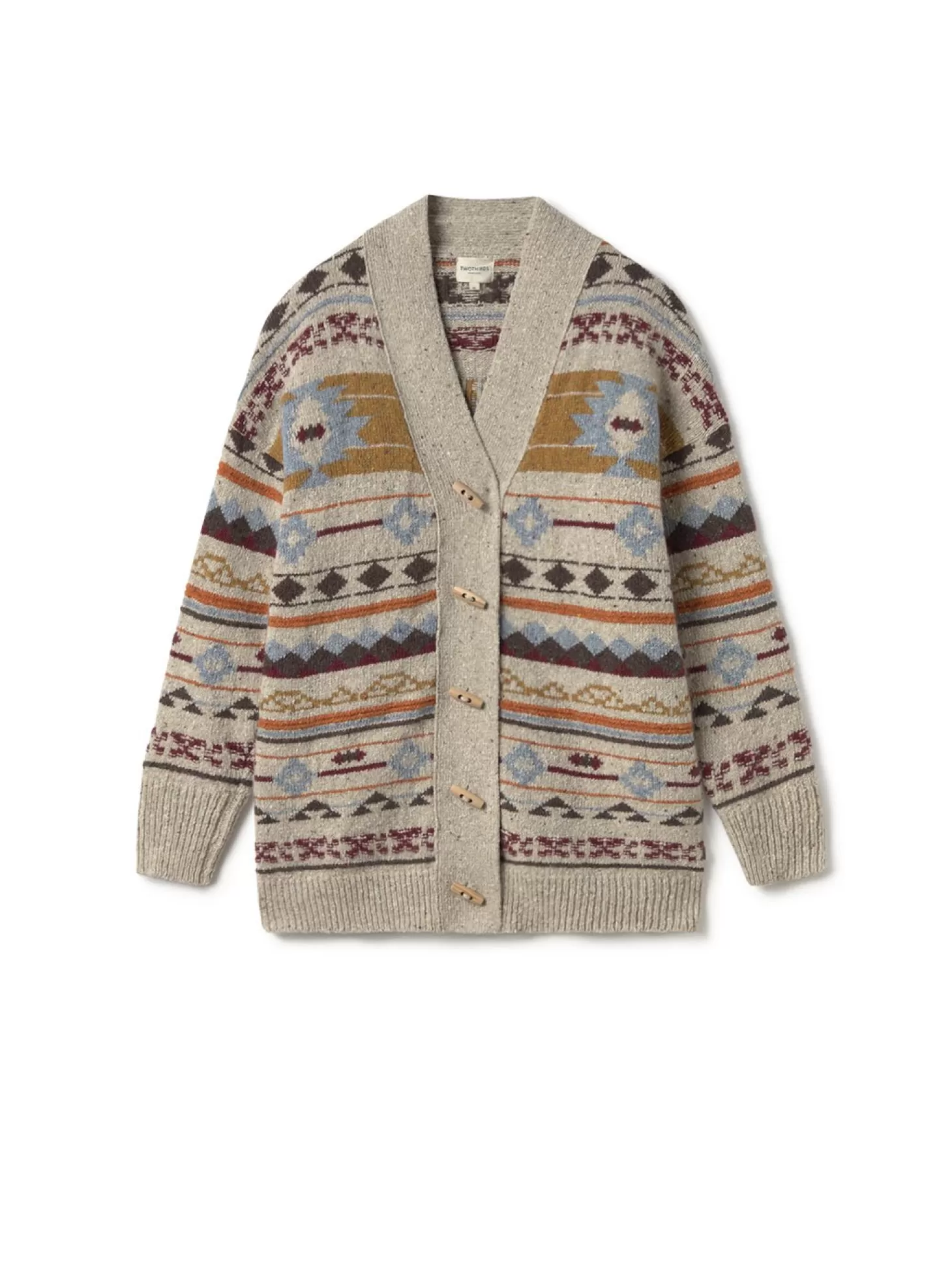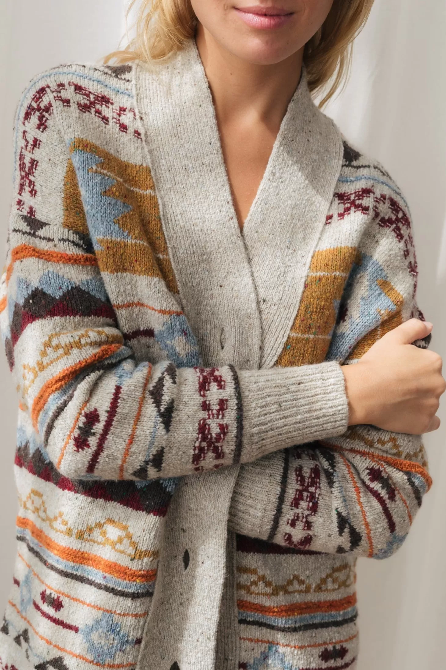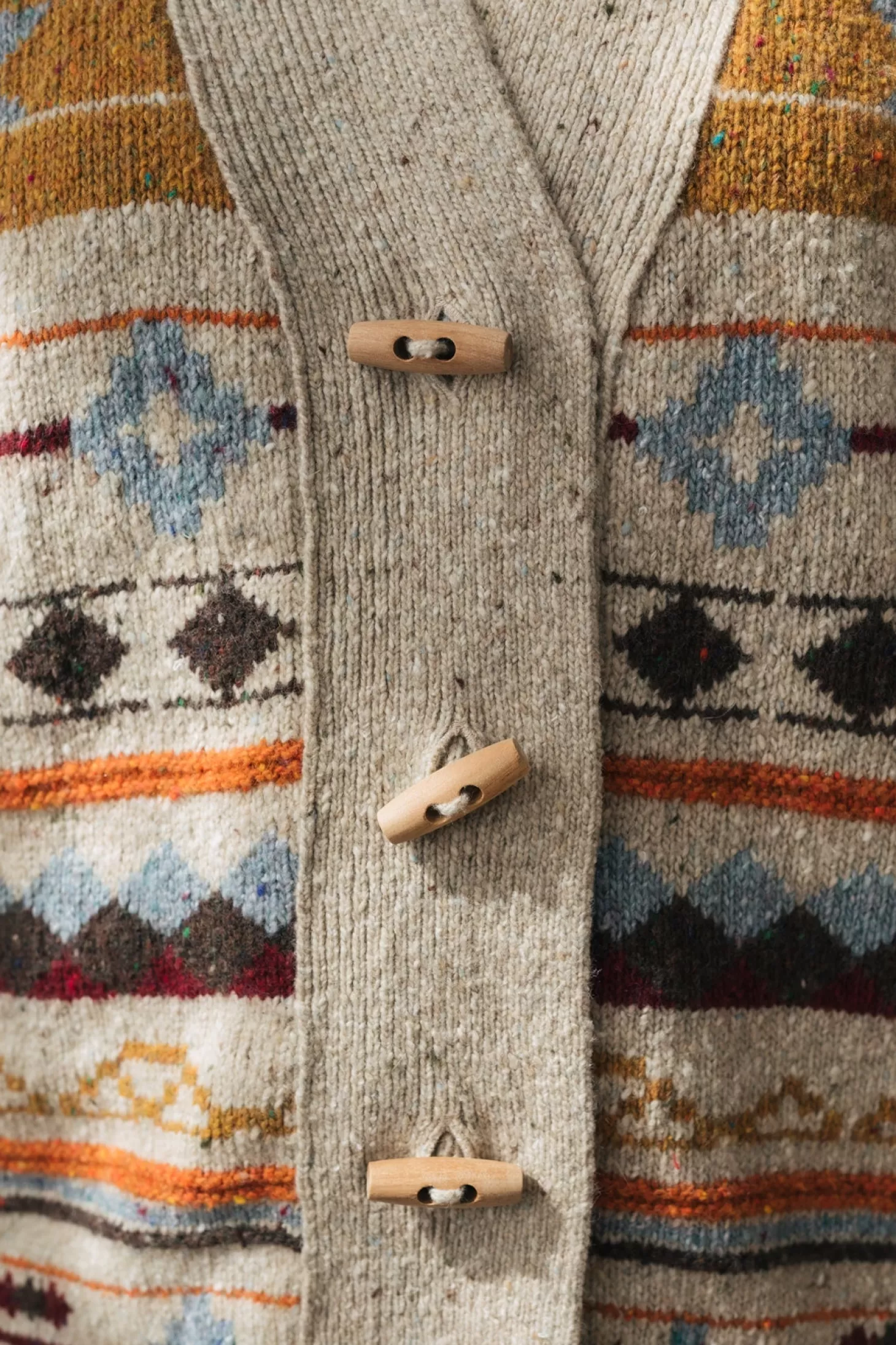 This jacquard sustainable cardigan comes with patterns designed to keep you as connected as possible to nature and the ocean. Natural wood toggles feature.
