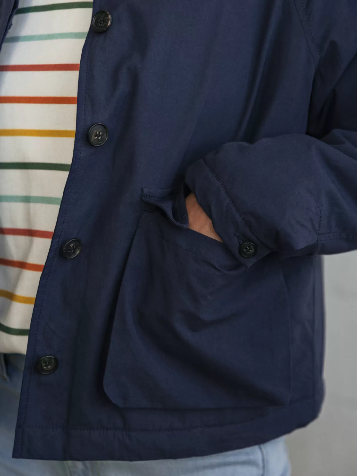 Ein weicher und anschmiegsamer Popeline-Stoff wird mit nachhaltigen Urea-Knöpfen und einer leichten Wattierung kombinie…
