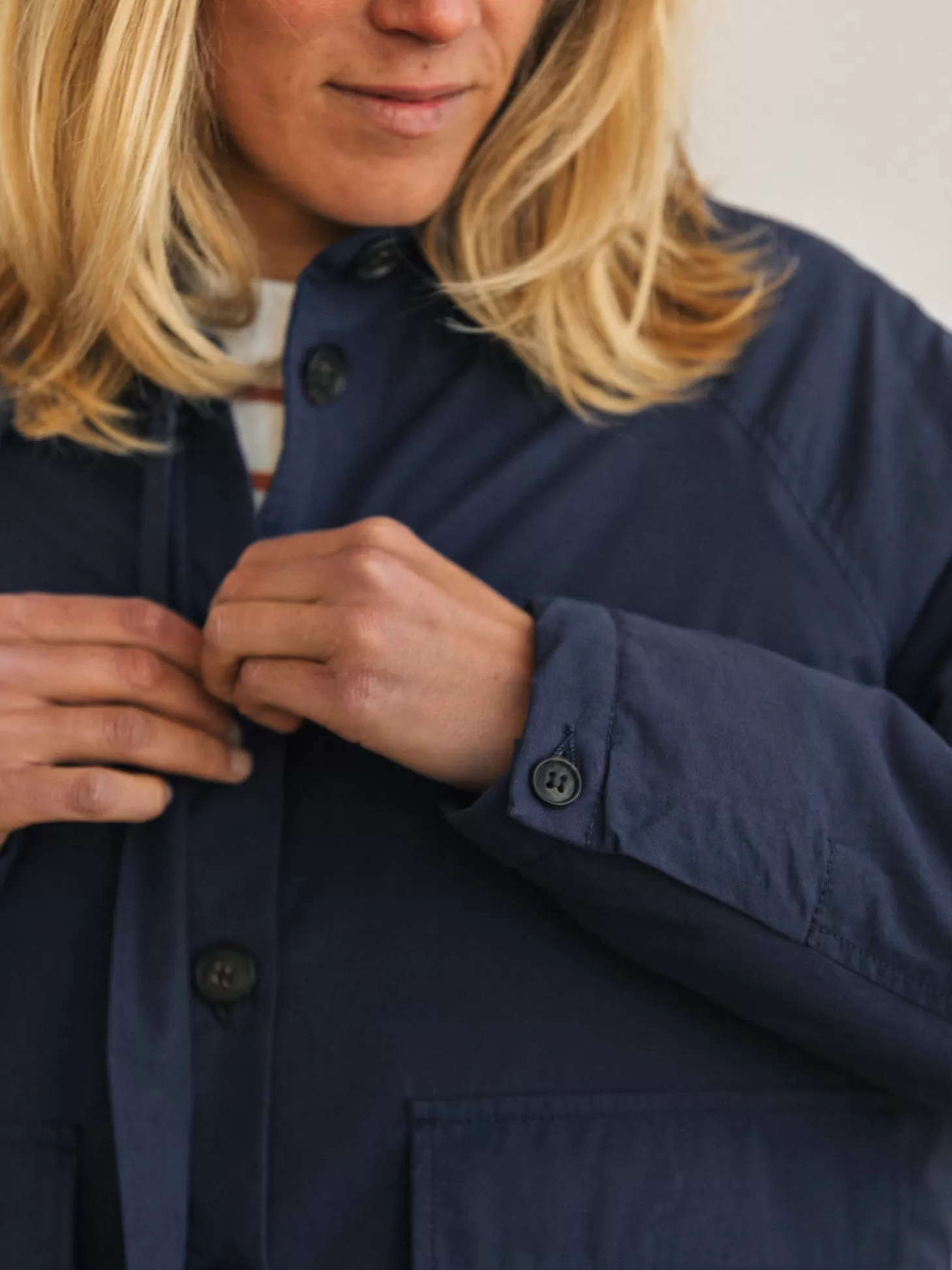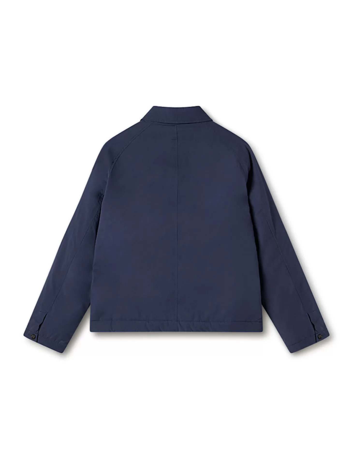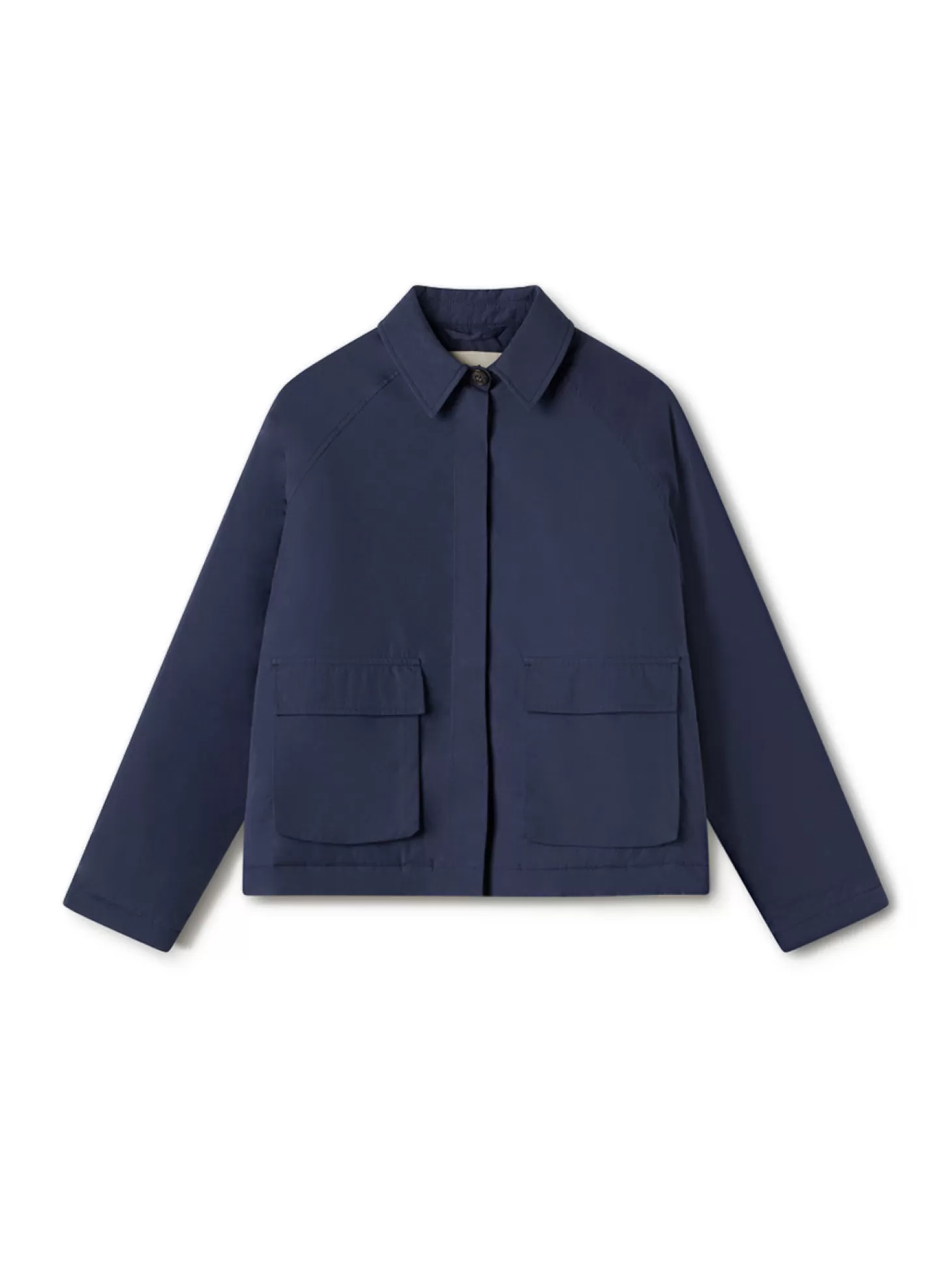 Ein weicher und anschmiegsamer Popeline-Stoff wird mit nachhaltigen Urea-Knöpfen und einer leichten Wattierung kombiniert, um diese schöne Jacke mit Kragen herzustellen. Sie hat Raglanärmel und zwei große Fronttaschen.