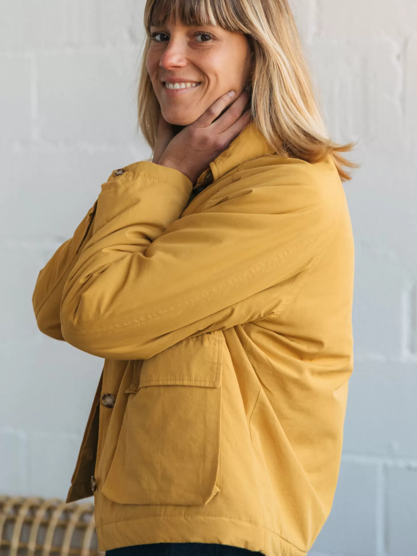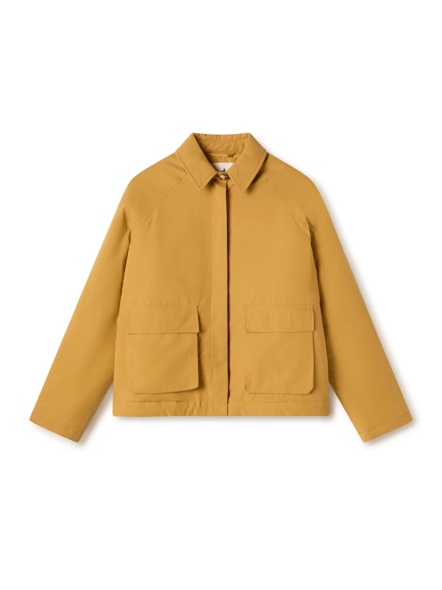 Ein weicher und anschmiegsamer Popeline-Stoff wird mit nachhaltigen Urea-Knöpfen und einer leichten Wattierung kombiniert, um diese schöne Jacke mit Kragen herzustellen. Sie hat Raglanärmel und zwei große Fronttaschen.