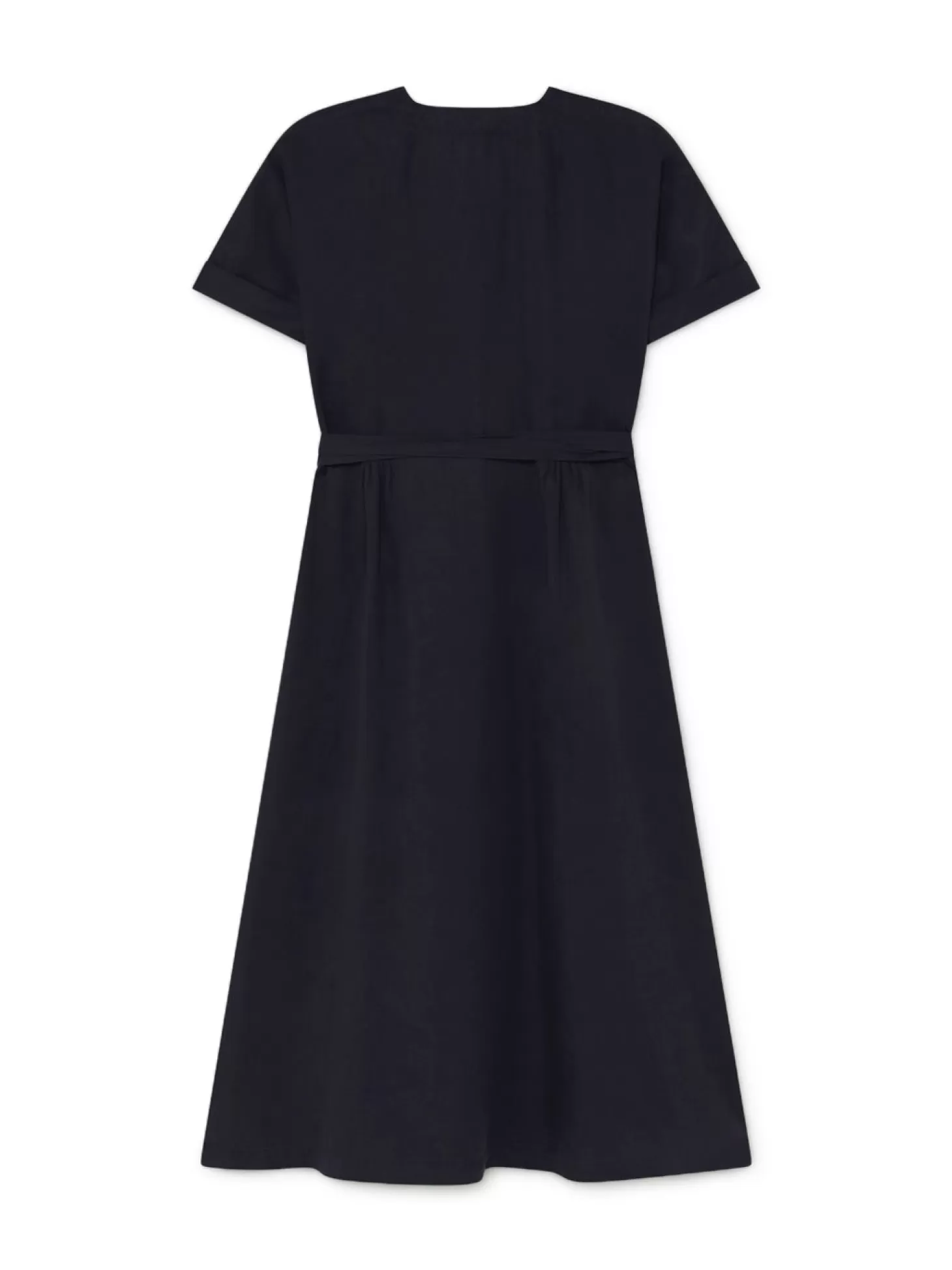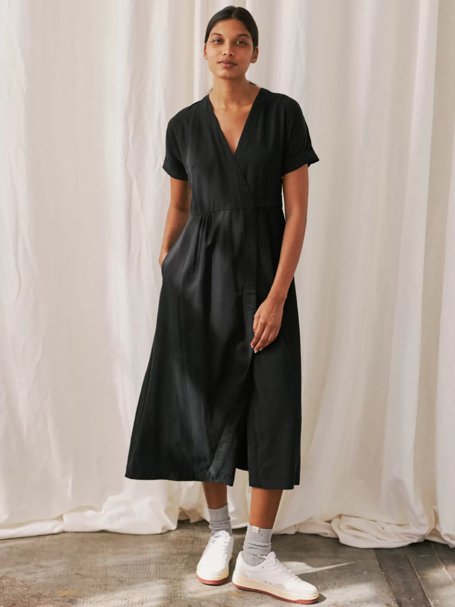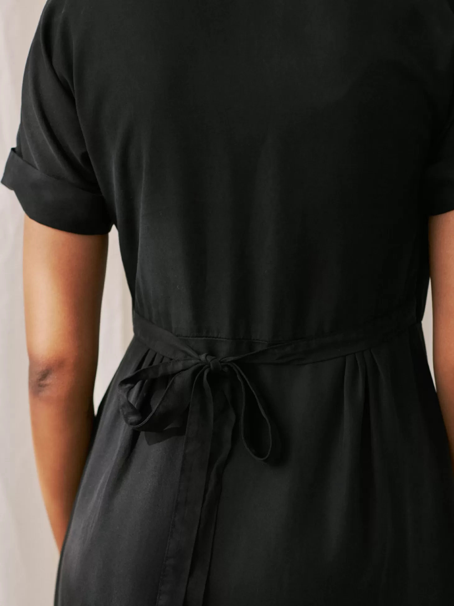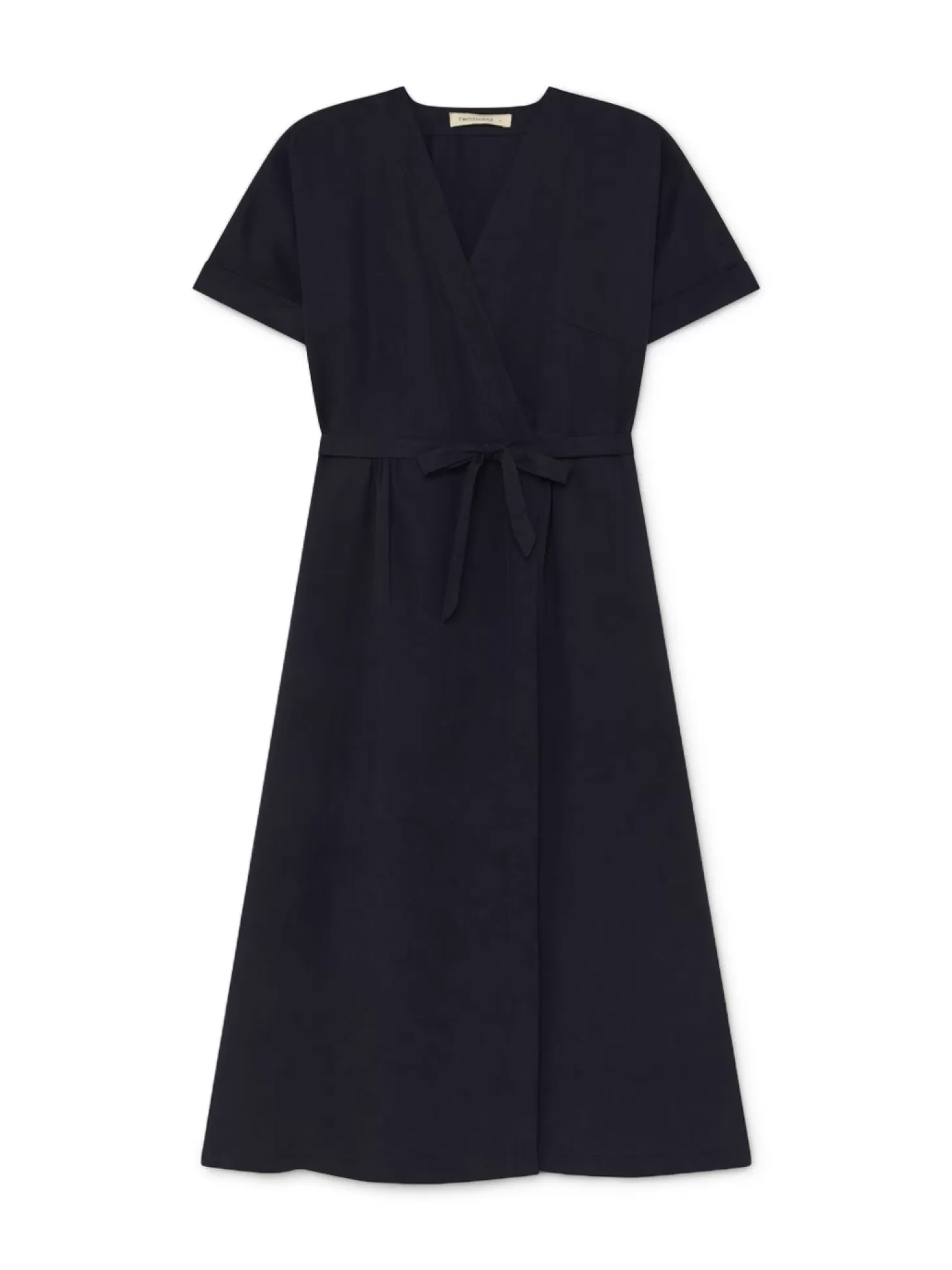 Dieses elegante Wickelkleid wird dank eines passenden Gürtels in der Taille geschlossen. Sein ansonsten minimalistisches Design wird durch Seitentaschen und seidig weichen Stoff ergänzt. Kombiniere es mit einer nachhaltigen Strickjacke!
