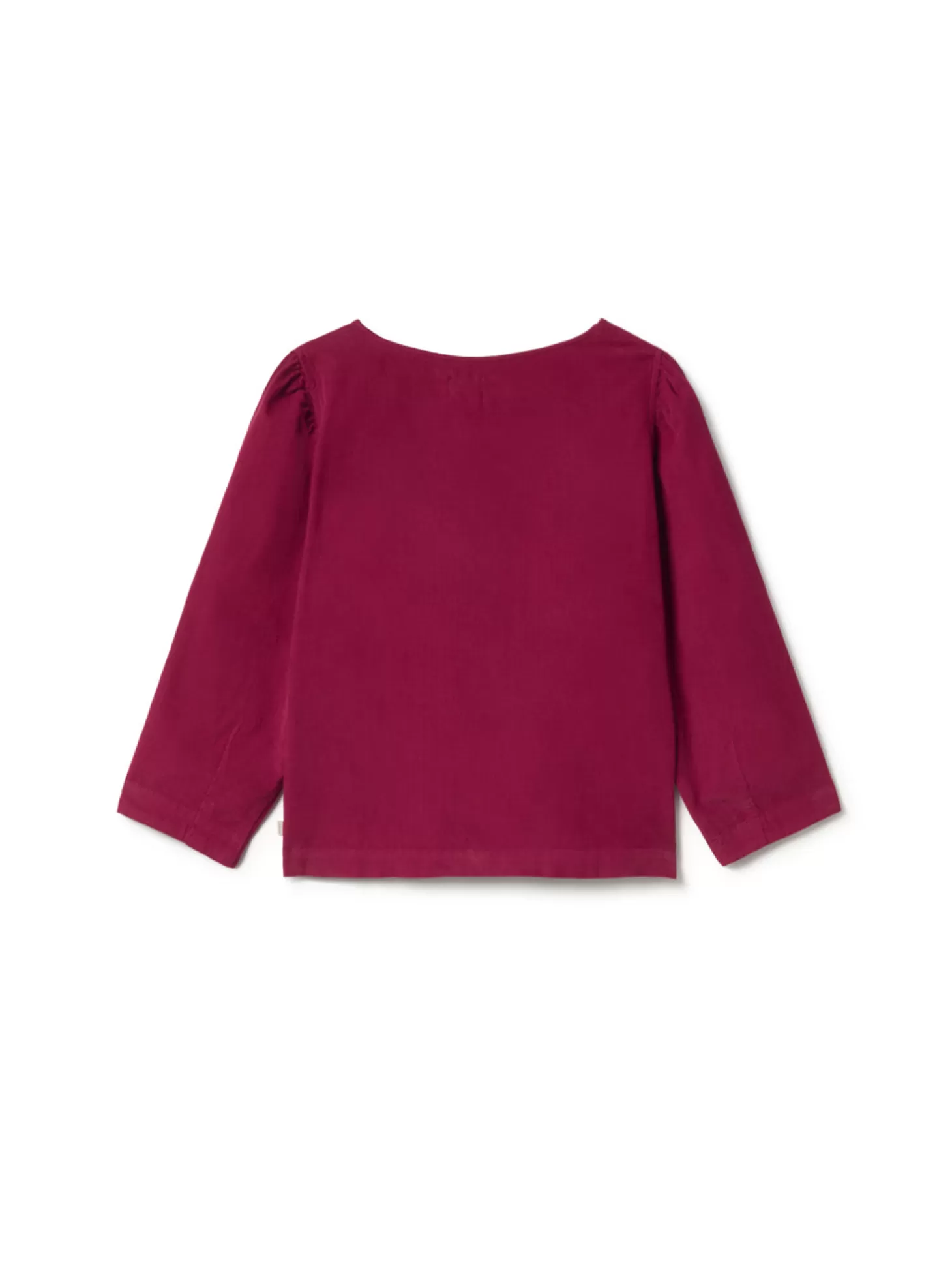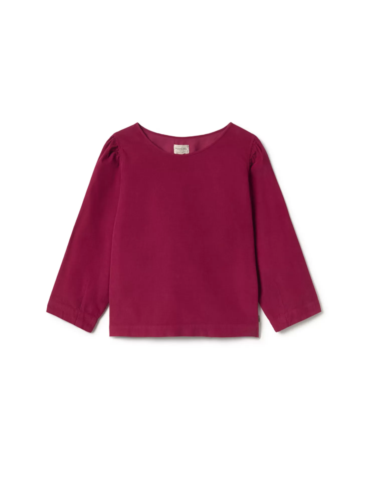 Ein kragenloses, knopfloses Hemd, das weite Dreiviertelärmel mit gerafften Schulterdetails verbindet. Das Hildasay ist aus üppigem Bio-Mikrocord gefertigt.