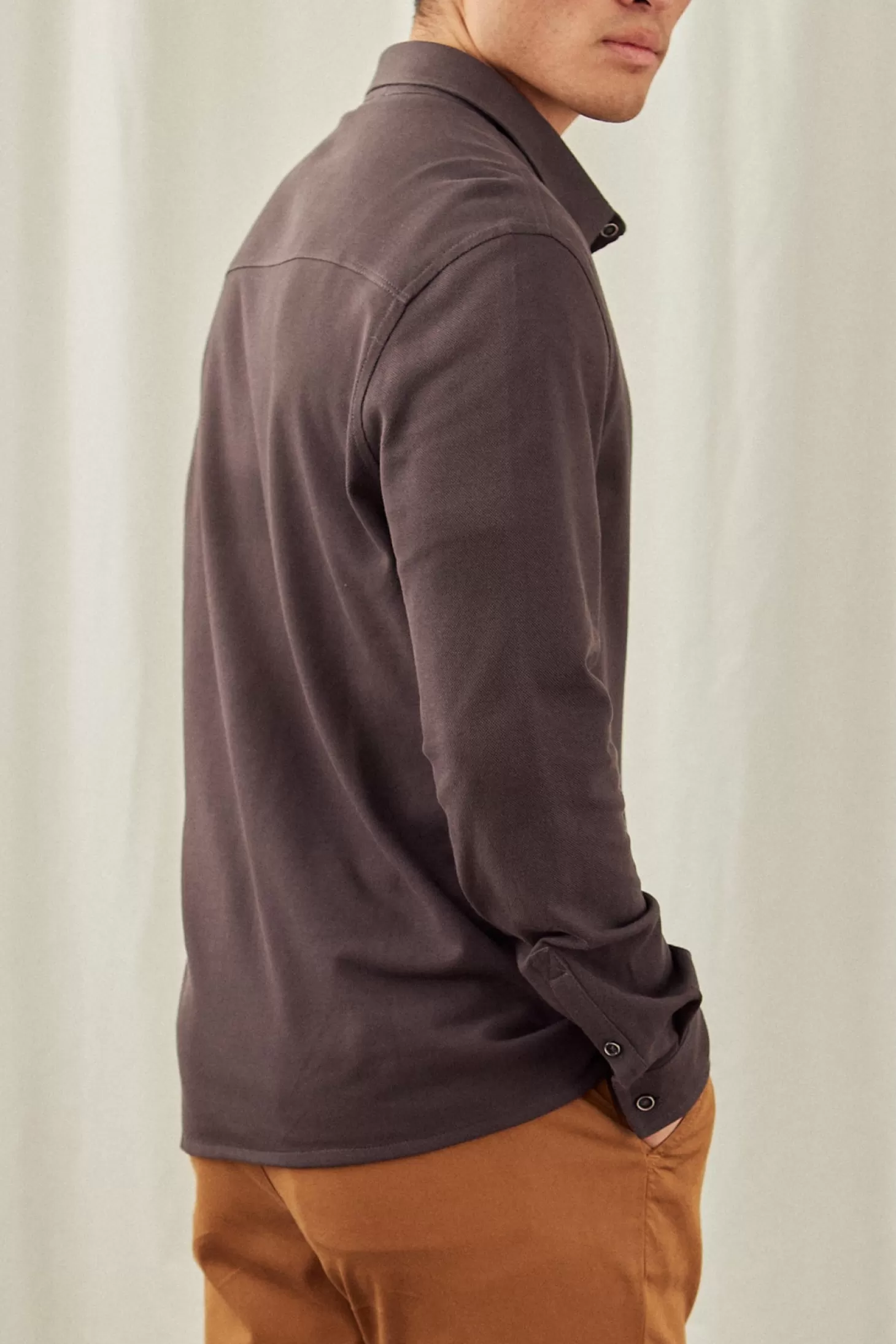 Piqué-Baumwollstoff gepaart mit langen Ärmeln ist die perfekte Lösung, wenn sich die Jahreszeiten im Handumdrehen ändern. „Twothirds“ ist auf die Knopfleiste des Kwale gestickt.