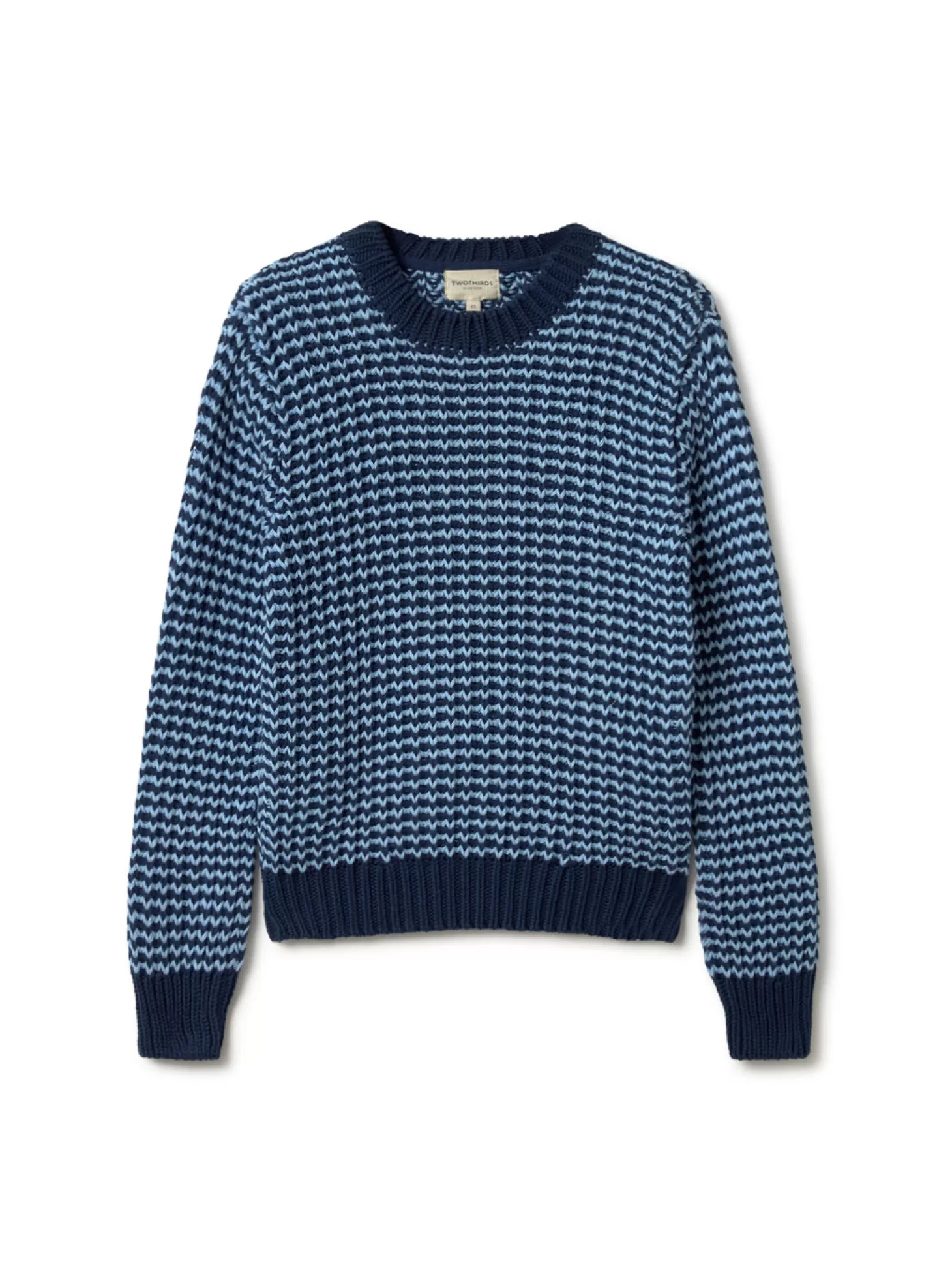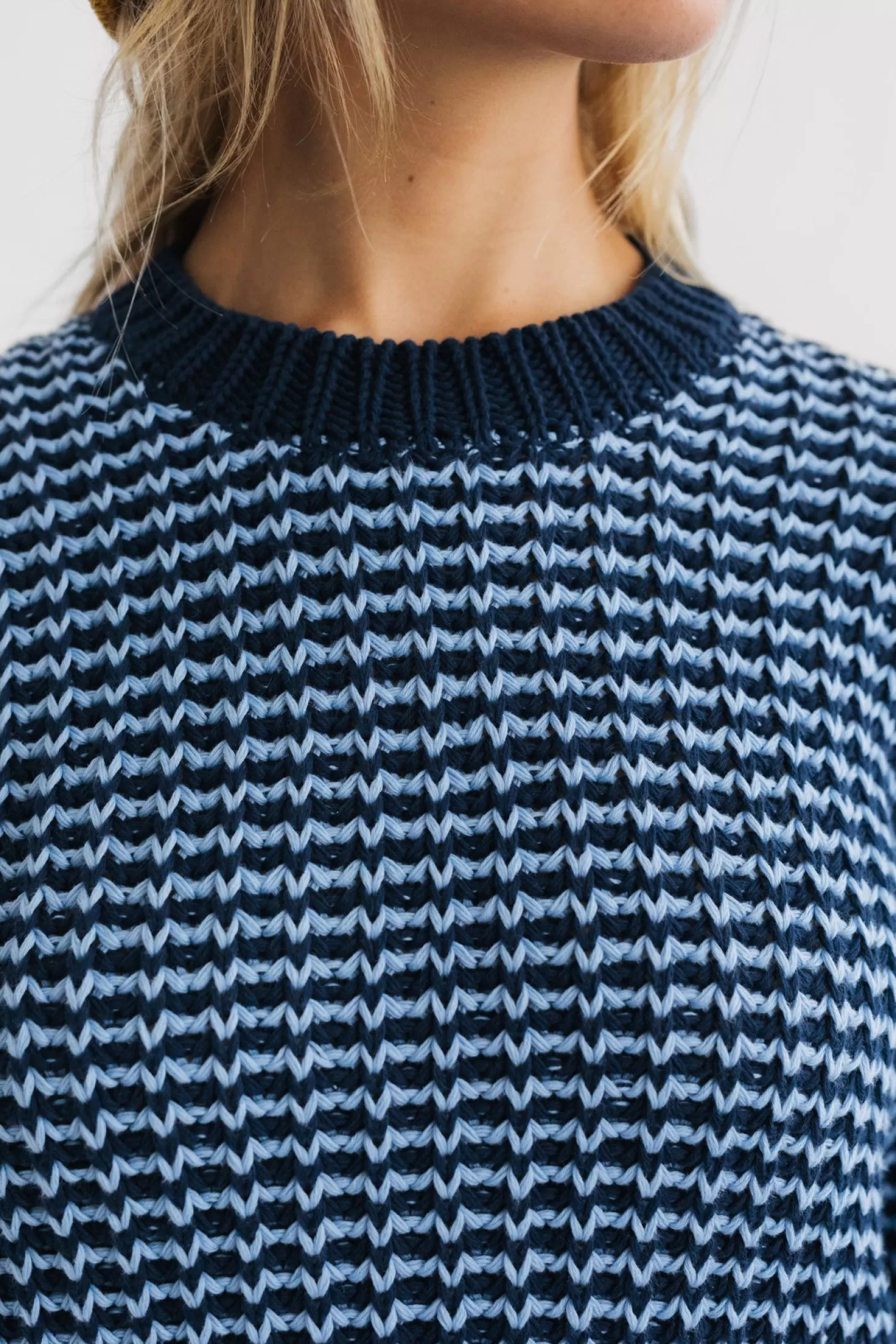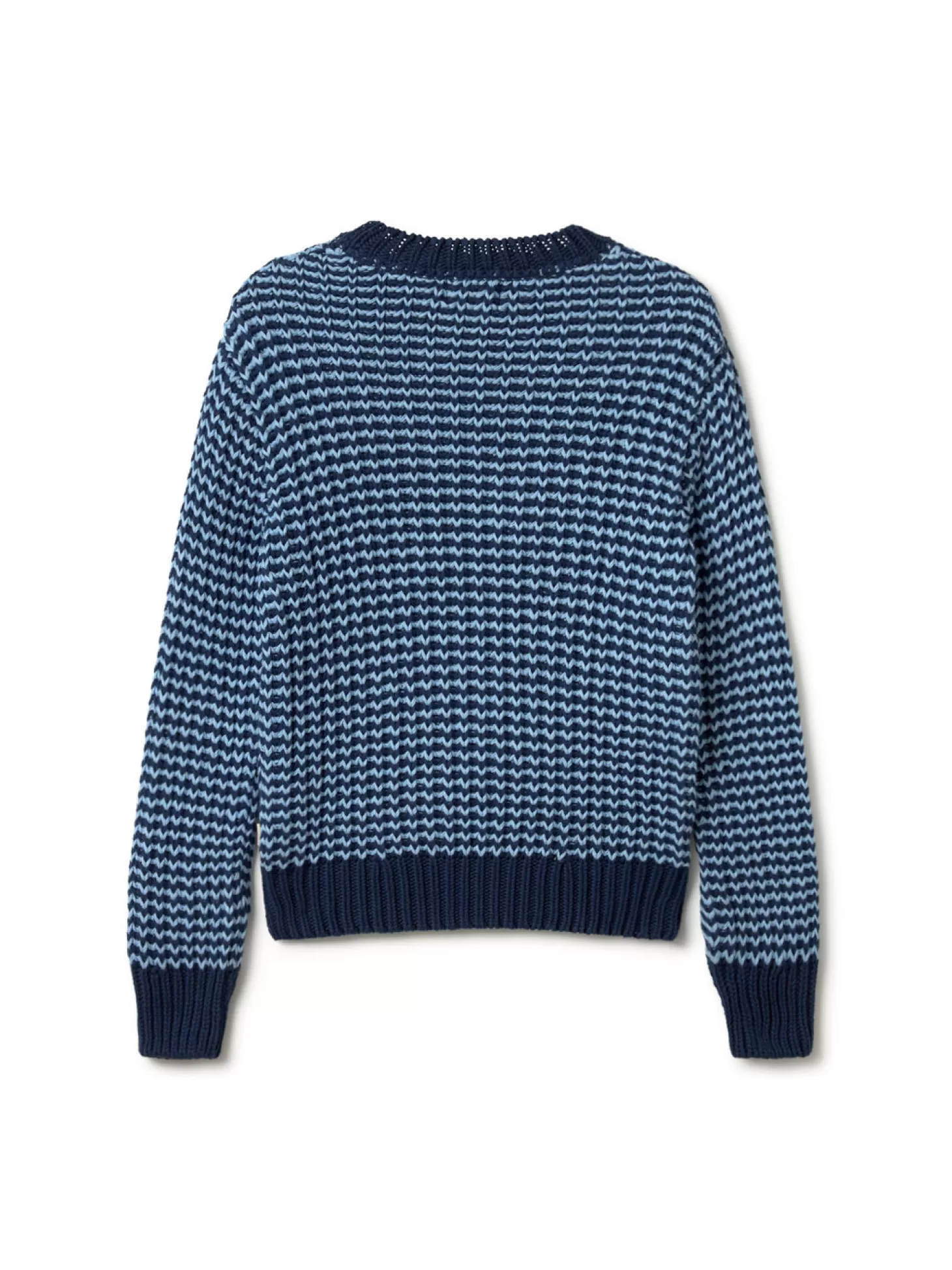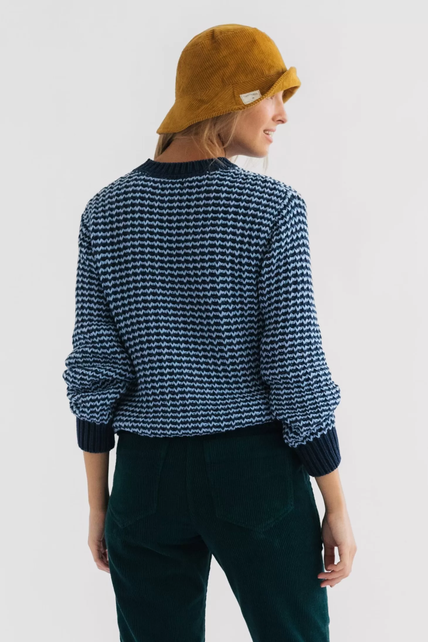 Chunky organic cotton means the Katiu thrives on windswept beaches. A wavy, ribbed pattern complements a solid colour neckline, cuffs and waistline.