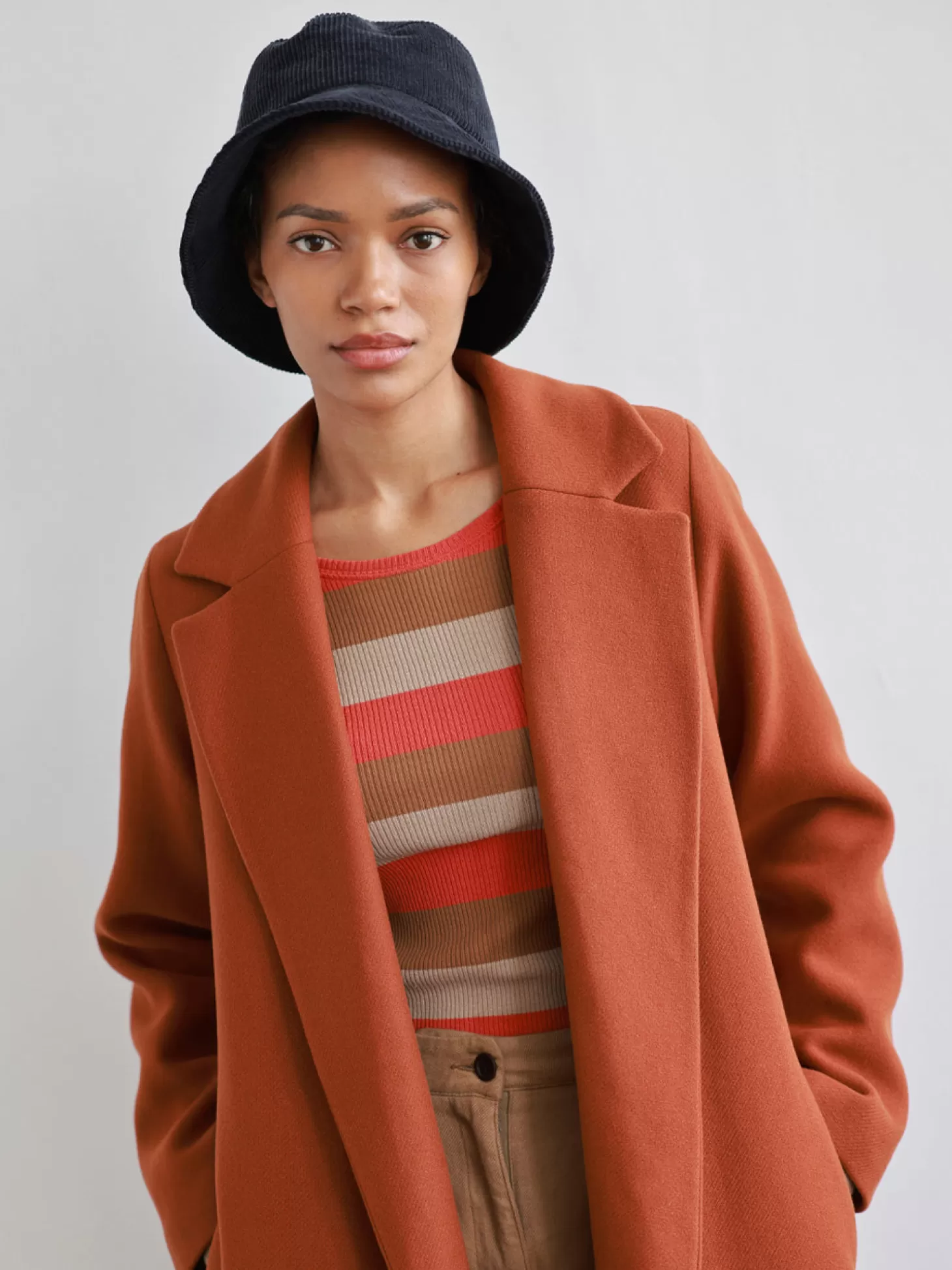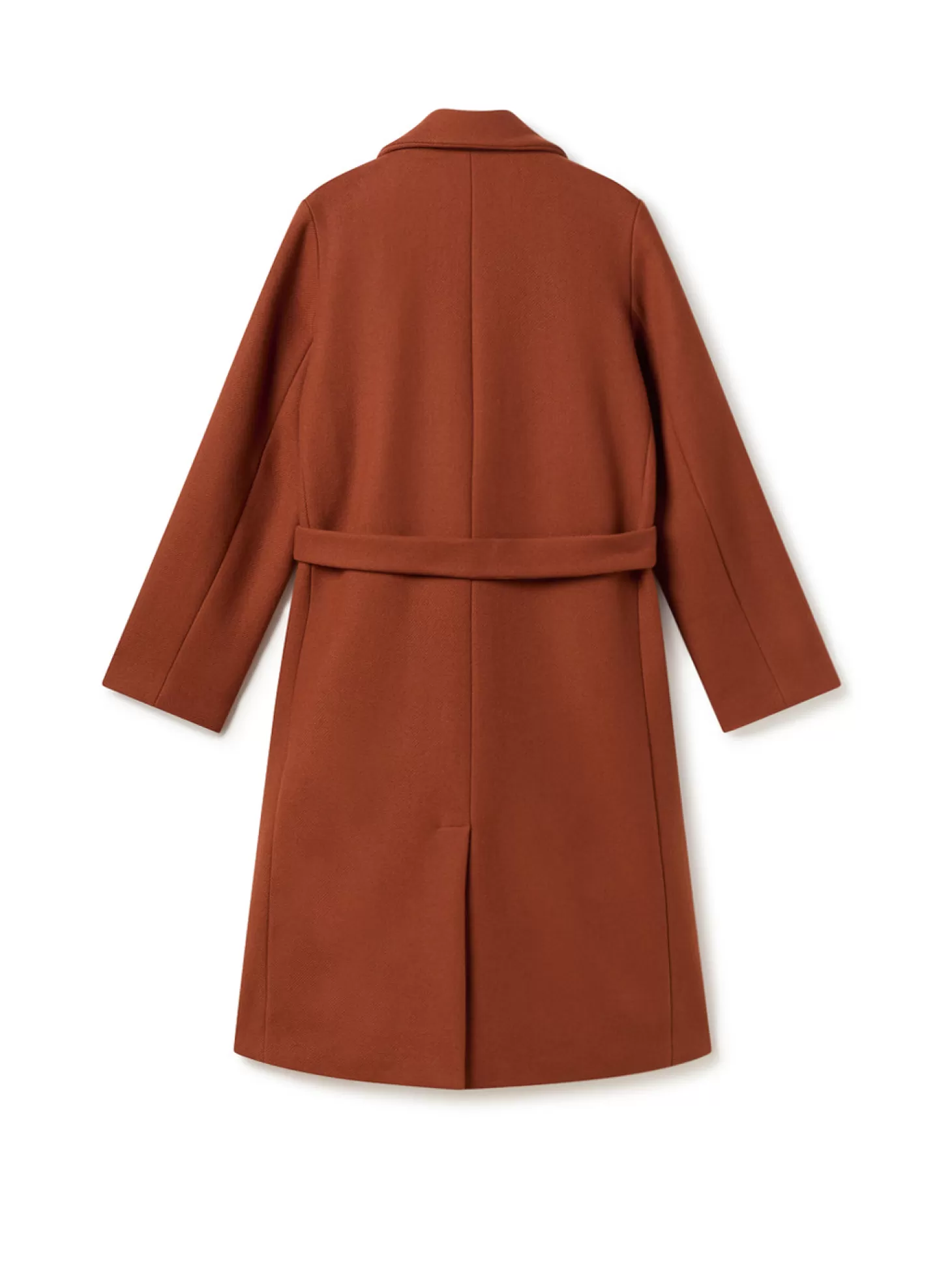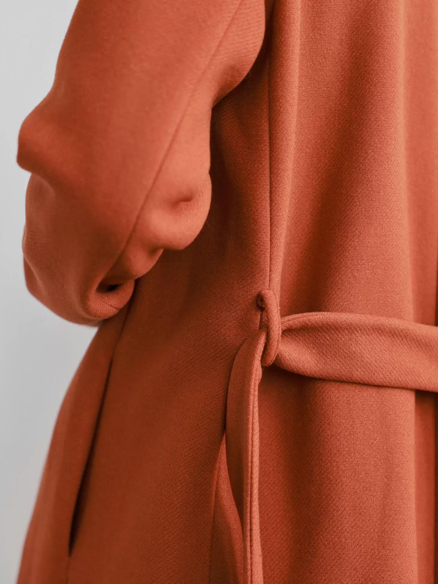 Der Tanaga ist aus einer kostbaren Wollmischung gefertigt und verfügt über einen passenden Stoffgürtel, fließende Linien und ein schmales Revers. Er hat versteckte Seitentaschen und einen Schlitz am hinteren Saum.