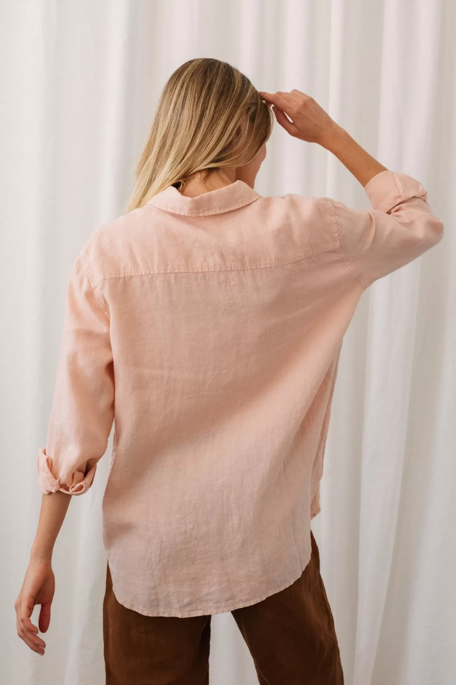Ein übergroßes Leinenhemd, das unzählige Outfit-Inspirationen bietet: Binde es vorne oder trage es schulterfrei, mit Gürtel, als kurzes Kleid, über einem Unterhemd, teilweise zugeknöpft … die Möglichkeiten sind endlos!