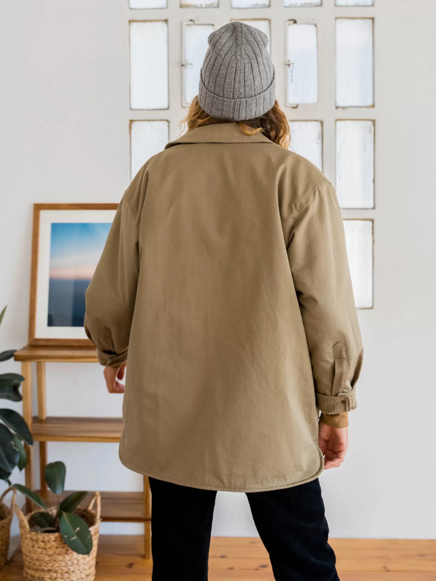 Diese Hemdjacke kann mit coolen Sweats und Cordwaren kombiniert werden. Die Ärmelumschläge und der Kragen sind mit Cordeinsätzen versehen. Brusttaschen, Druckknöpfe und abgerundete Seitenausschnitte runden das Bild ab.
