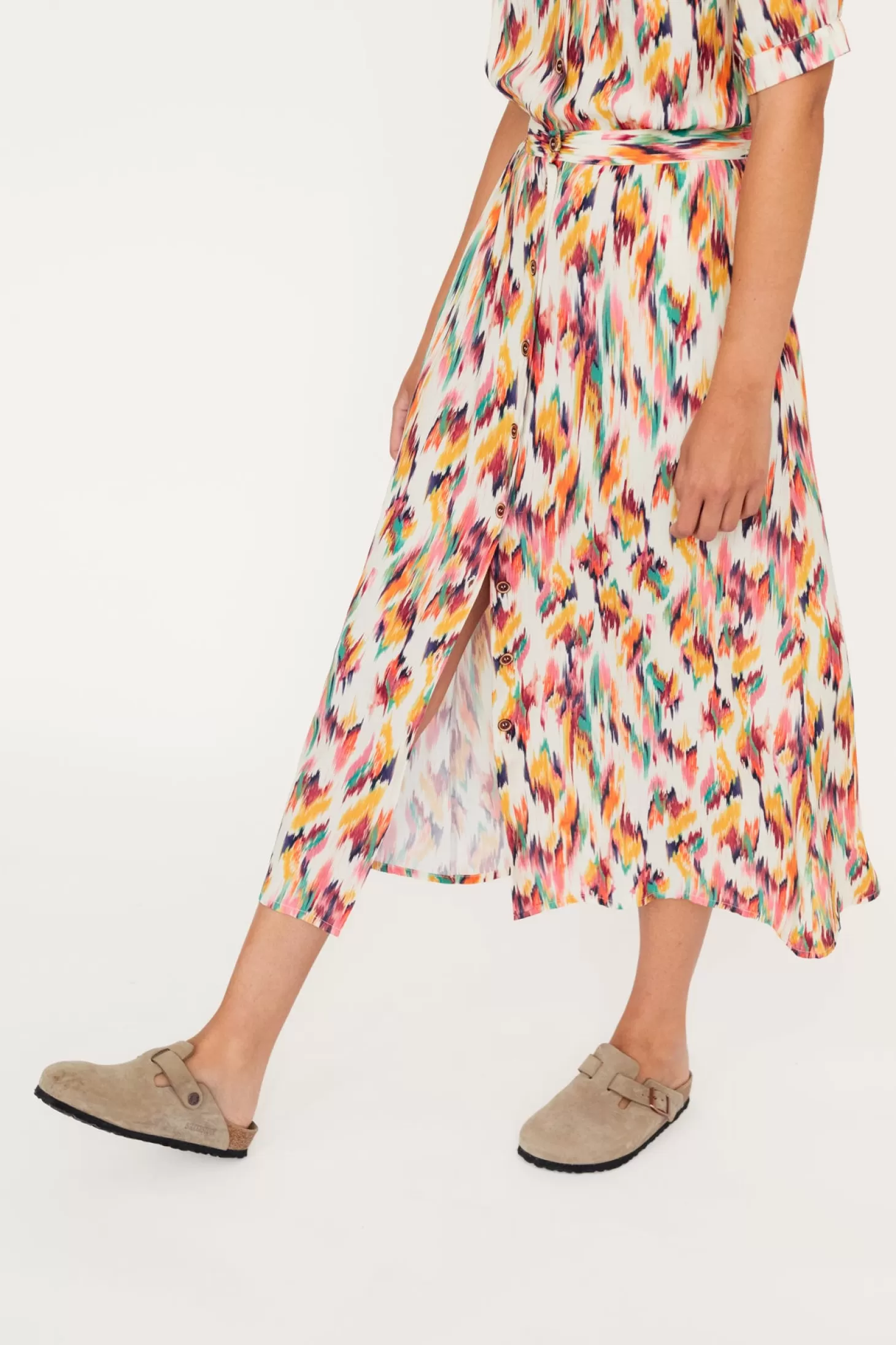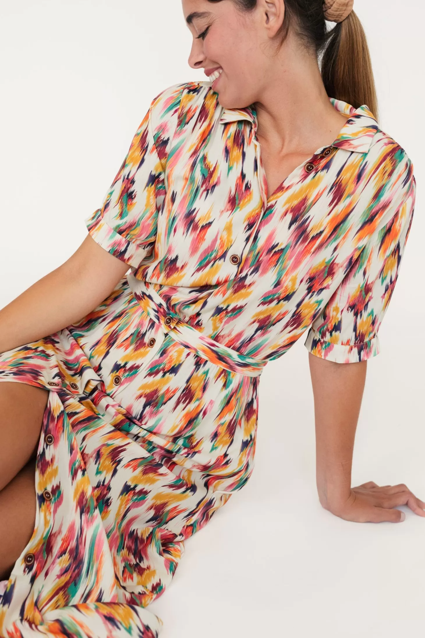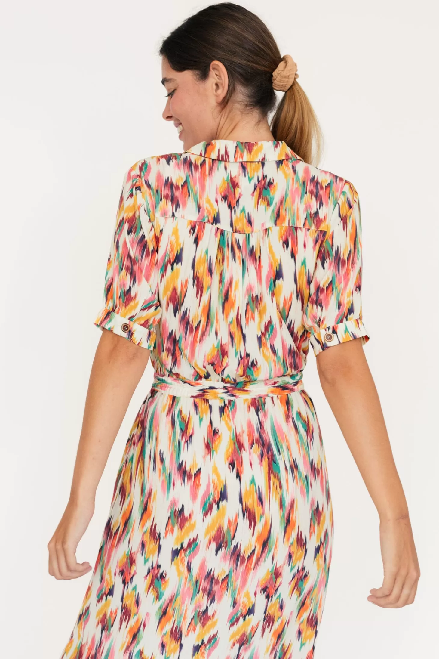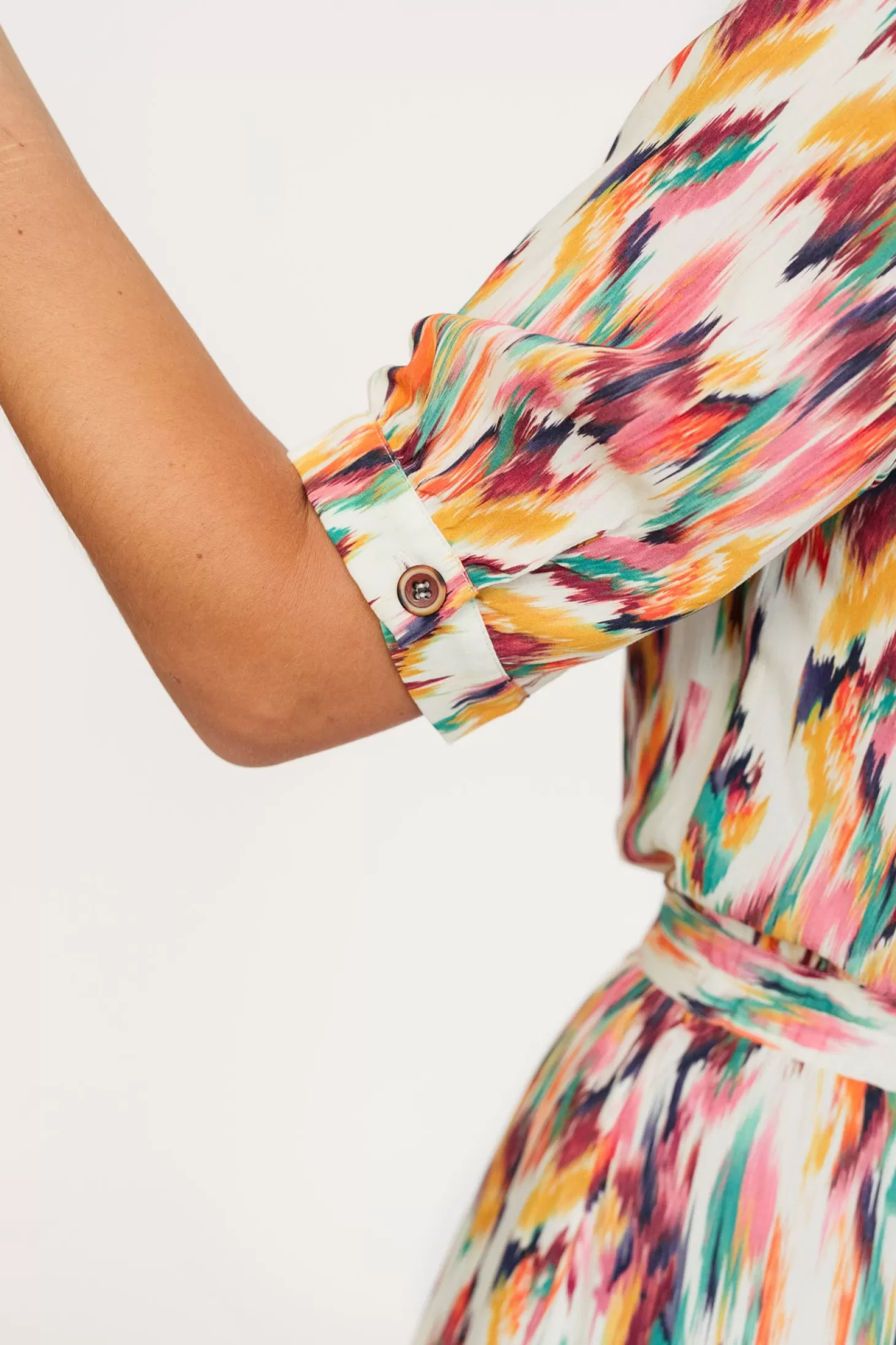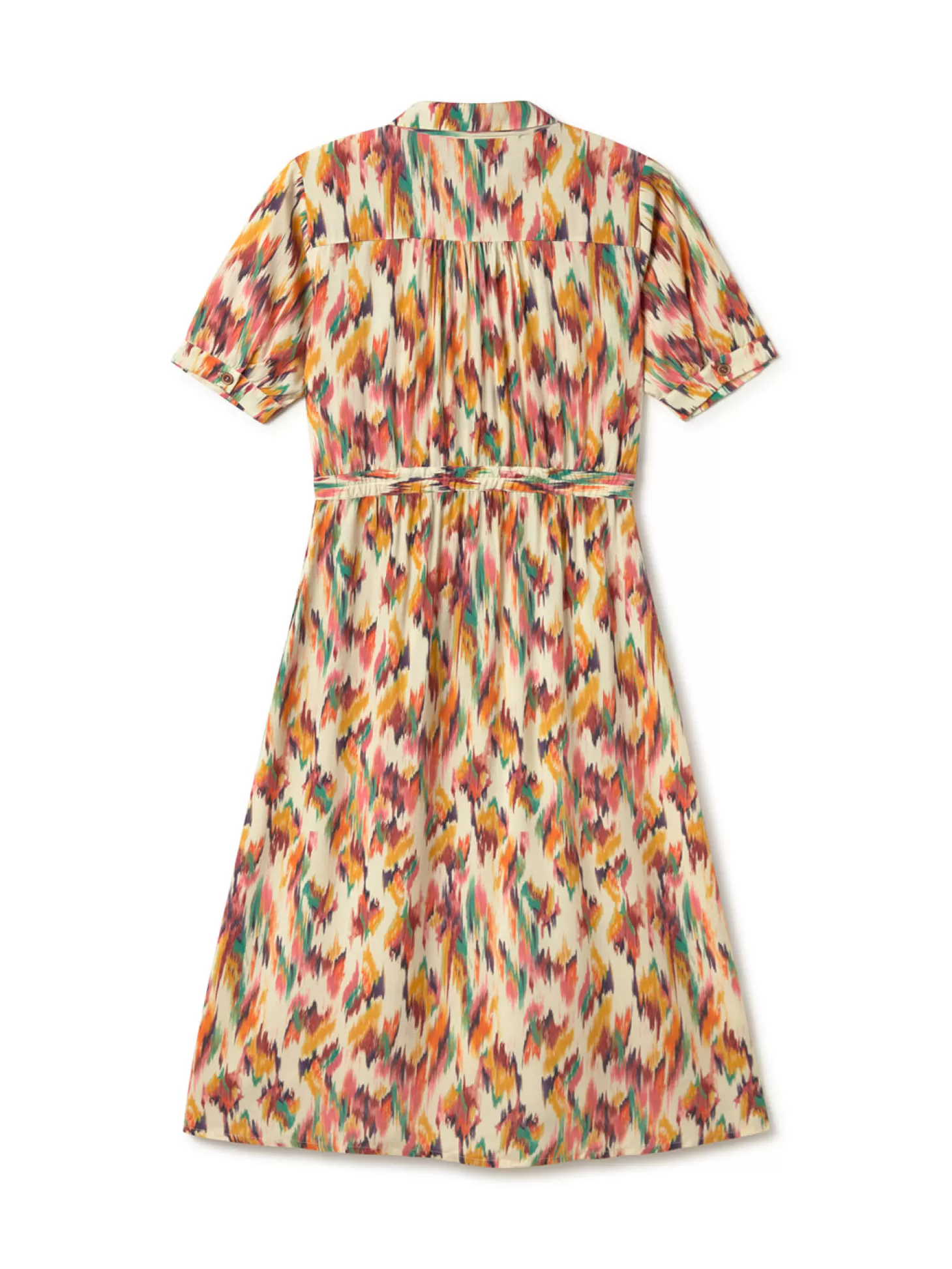 Das Matsu-Kleid mit Aquarell-Muster ist aus umweltfreundlichster Viskose gefertigt und verfügt über einen elastischen Bund hinten, Seitentaschen sowie hübsche, geknöpfte Manschetten.