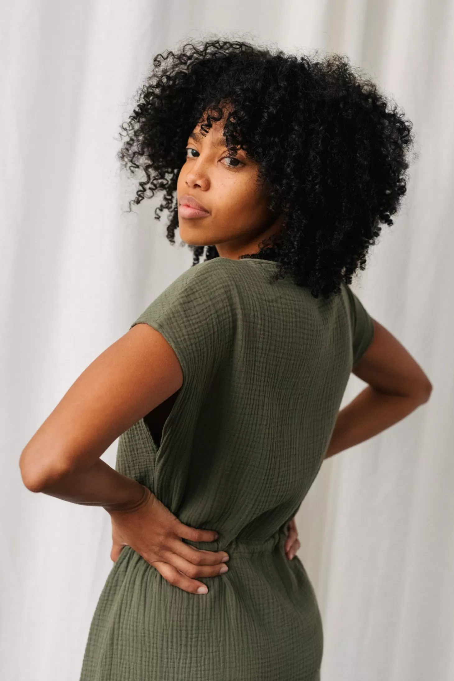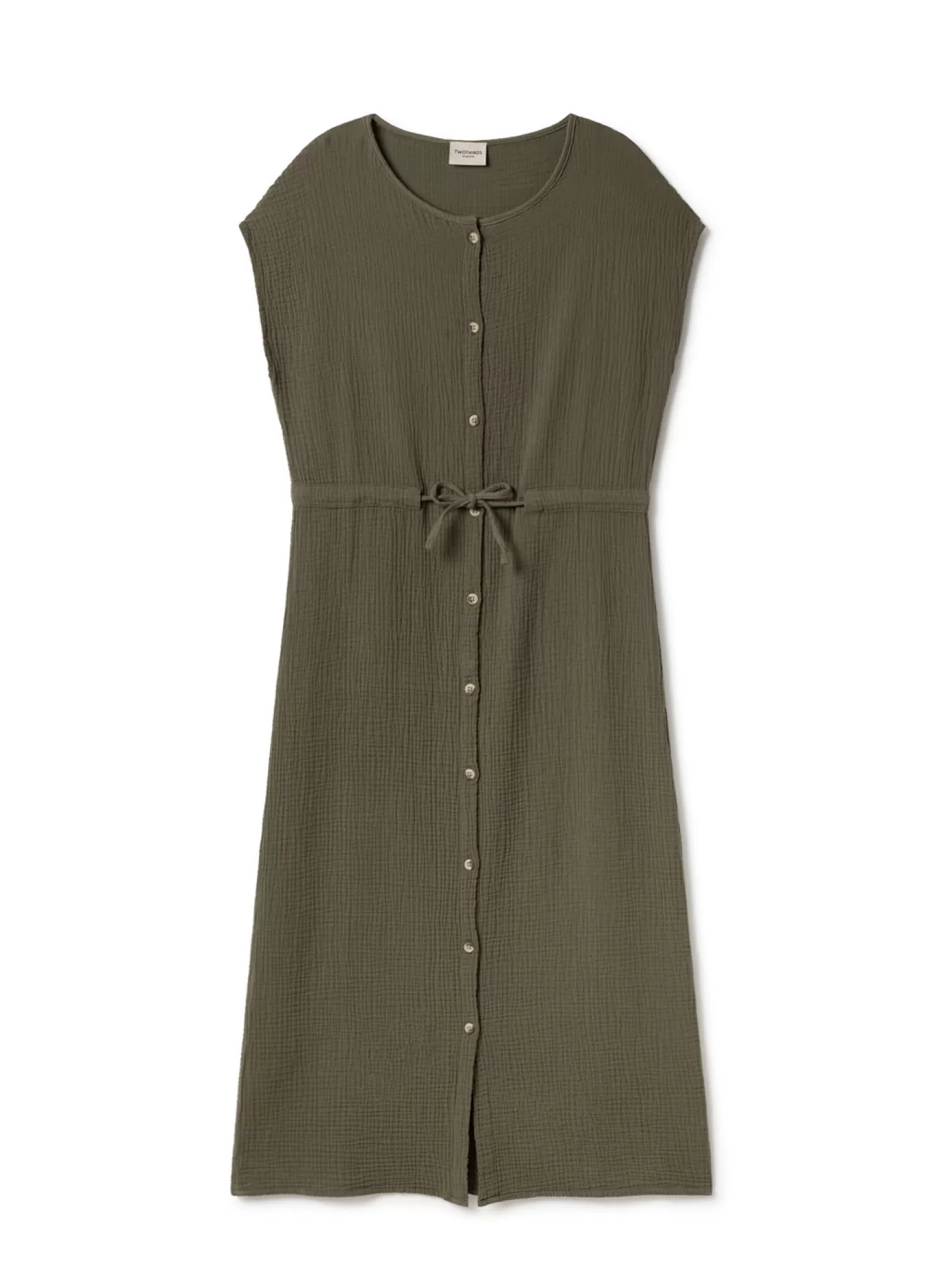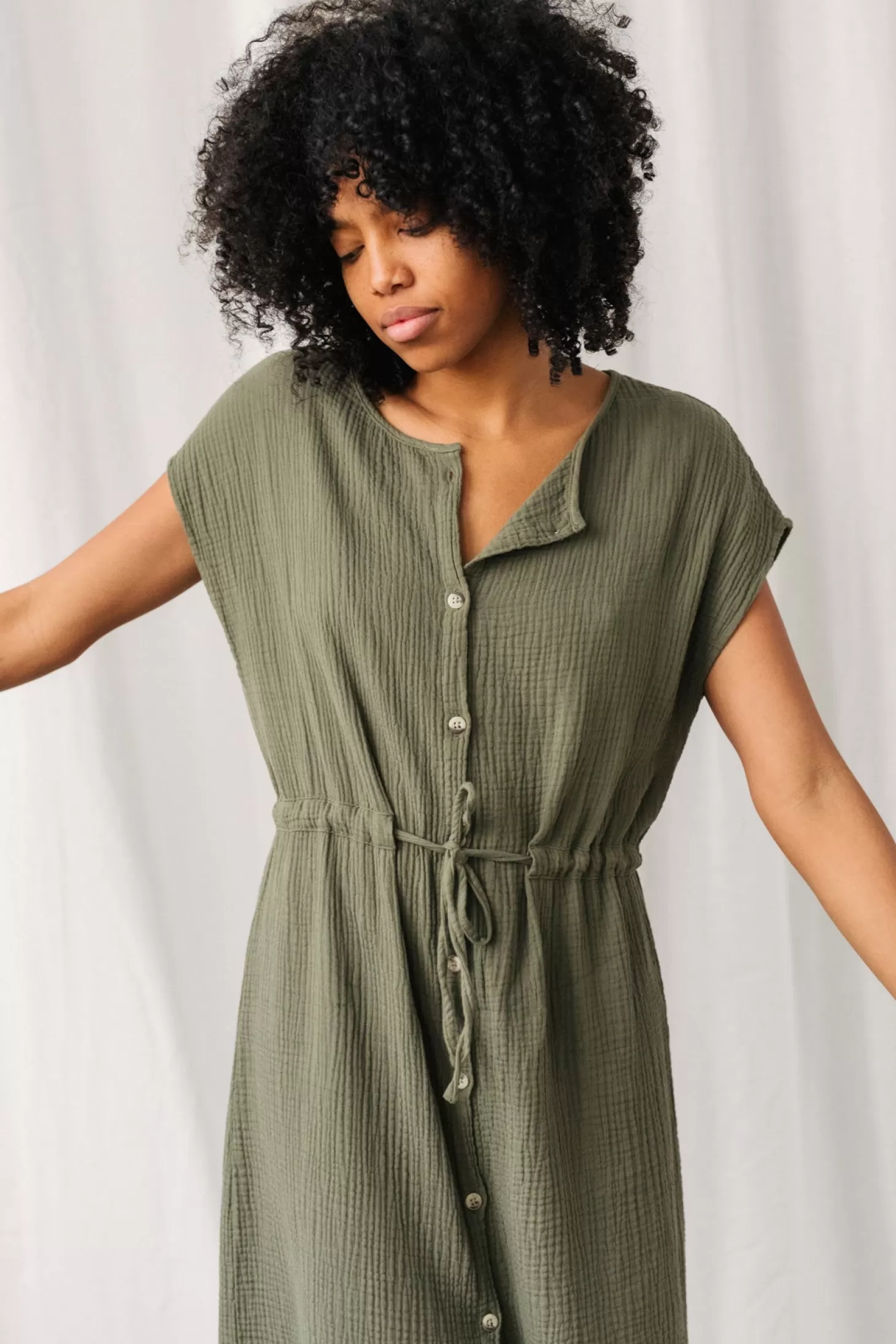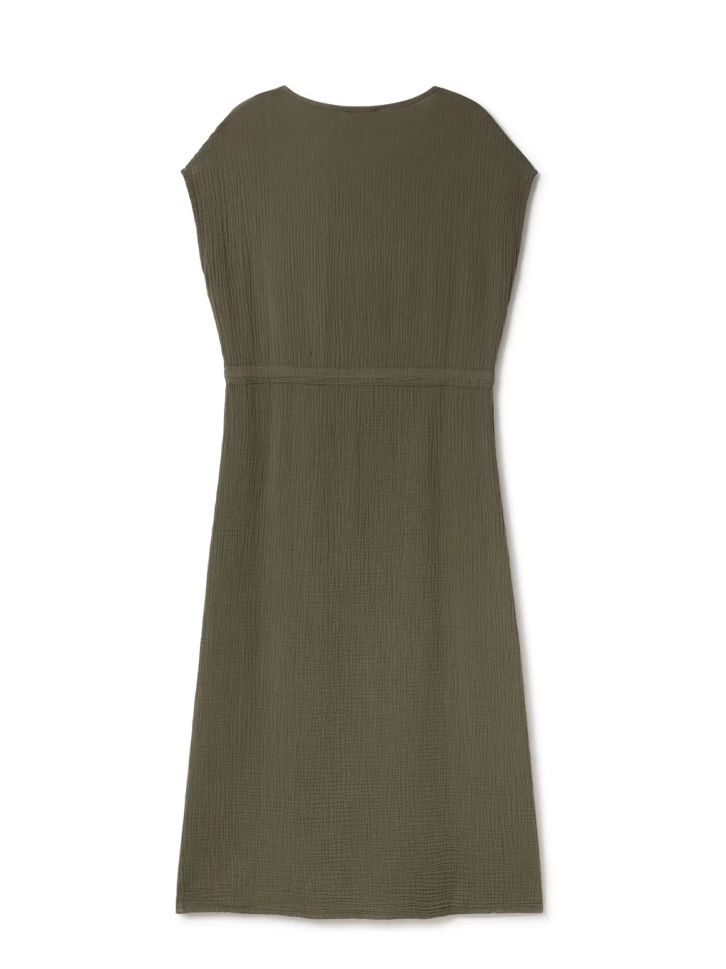 Unser Taukihepa-Kleid besteht aus dem weichsten Bio-Musselin-Stoff und verfügt über elegante gekürzte Ärmel sowie einen Kordelzug in der Taille und wunderschön minimalistische gefaltete Säume.